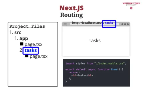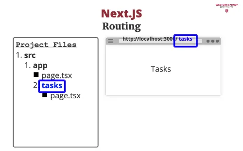 With NextJS it's easy! All we have to do is to create a new directory named "tasks", representing the URL path "/tasks". Inside that directory we create the page.tsx file with the source code of the page.