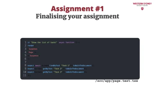 When you open the src/app/page.test.tsx file, you see that we expect to see “Task 1”, “Task 2” and “Task 3” in the document. This should be understandable from the code below: