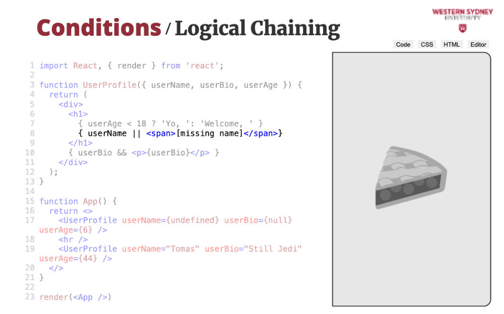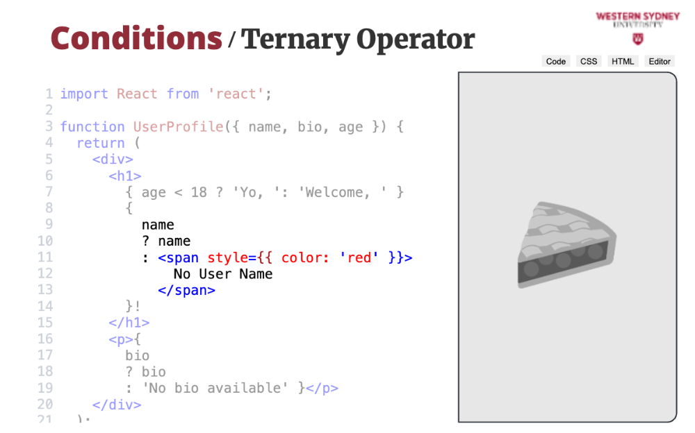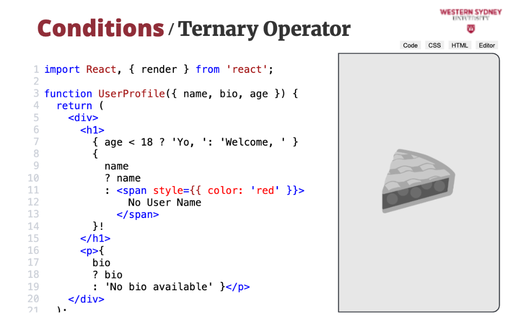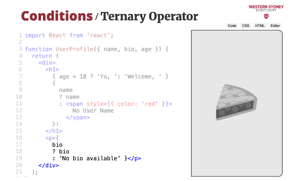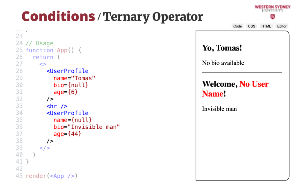 The second ternary operator renders the user's name or shows an error that this data is missing. See that we can return JSX code in the ternary operator as well!