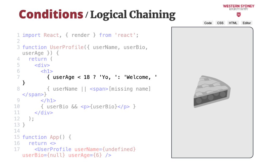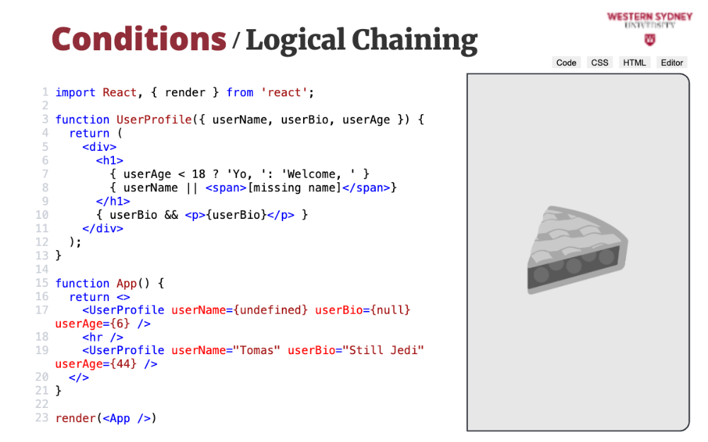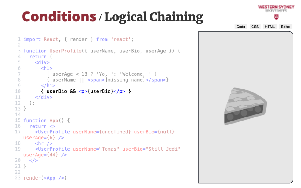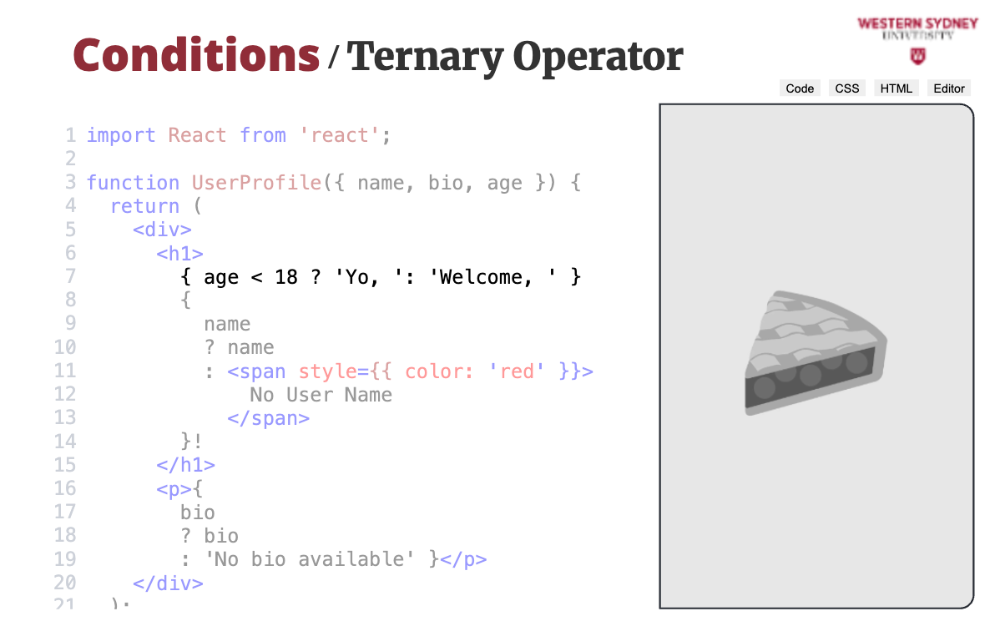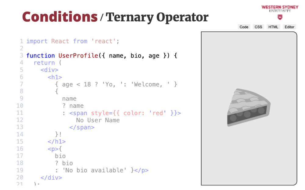 The second ternary operator renders the user's name or shows an error that this data is missing. See that we can return JSX code in the ternary operator as well!