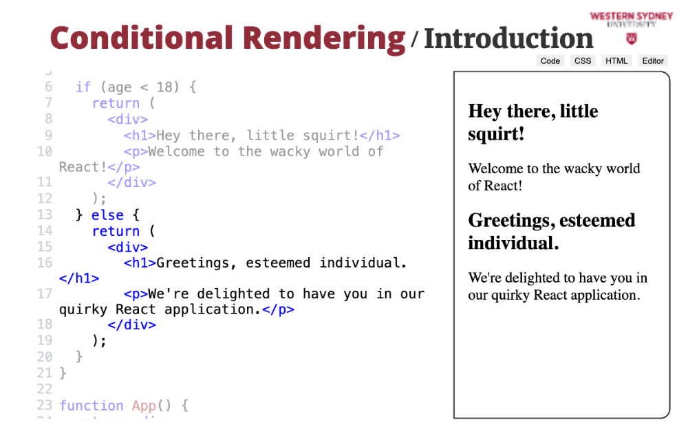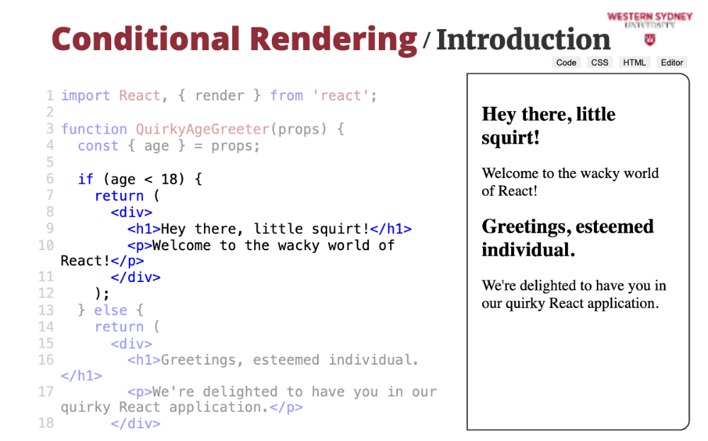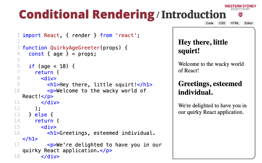 }In this example, we check if the age prop is less than 18. If it is, we render a silly greeting for kids. If not, we will render a more formal greeting for adults.
