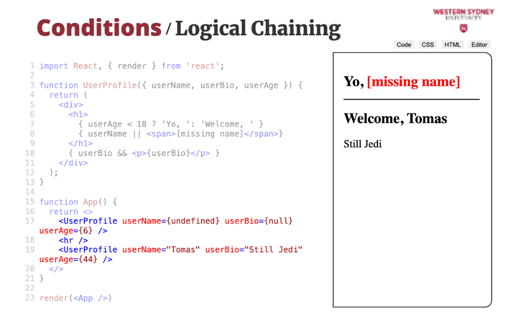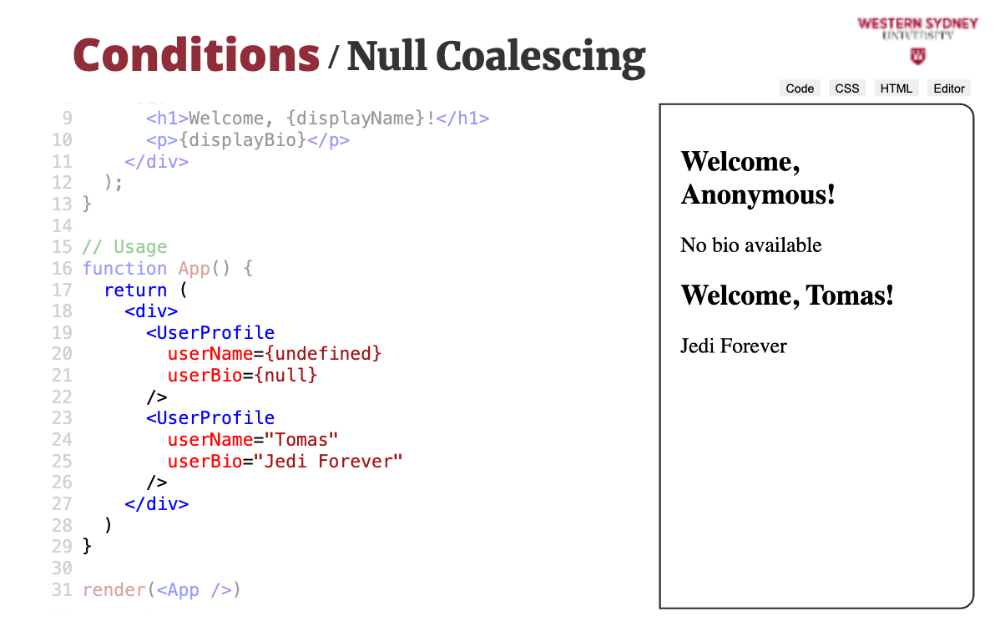 { userName || <div>Error: You need to provide the user name</div>}! Here, the <strong>||</strong> operator is used to provide a default value if userName is falsy (e.g., null, undefined, false, 0, "", or NaN).`