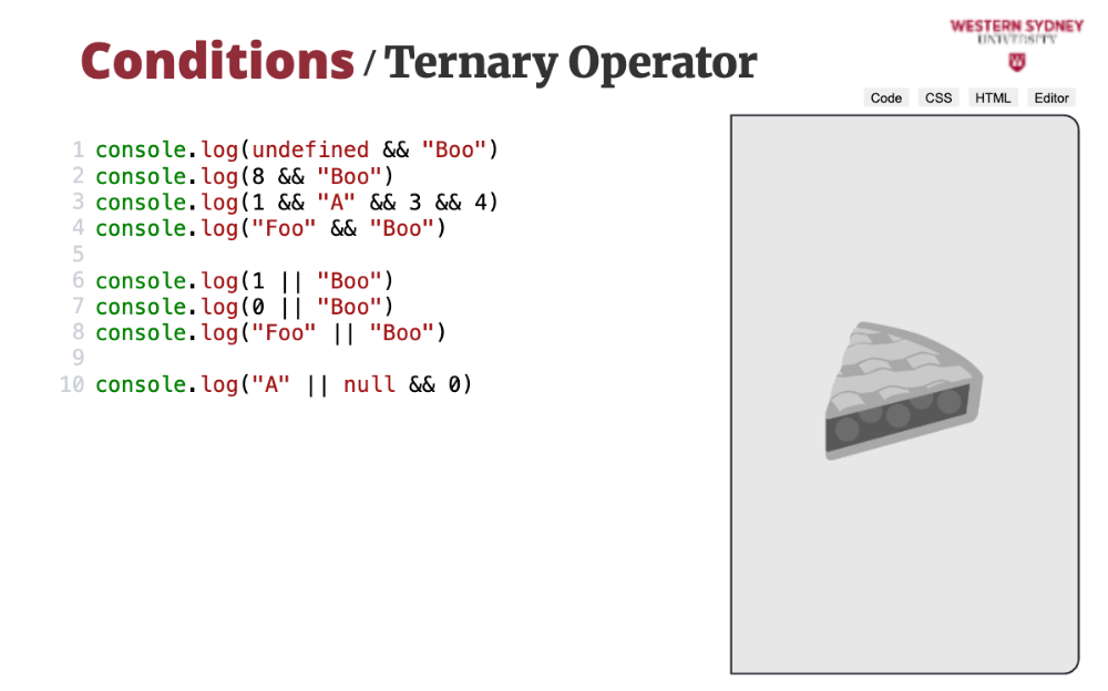 The ternary operator is another useful tool in JavaScript and React for handling conditional logic in a concise way. It's often used to choose between two values based on a condition, essentially creating an if-else branching. The syntax for the ternary operator is <strong>condition ? valueIfTrue : valueIfFalse</strong>.