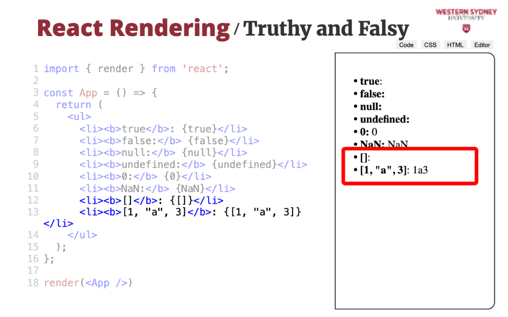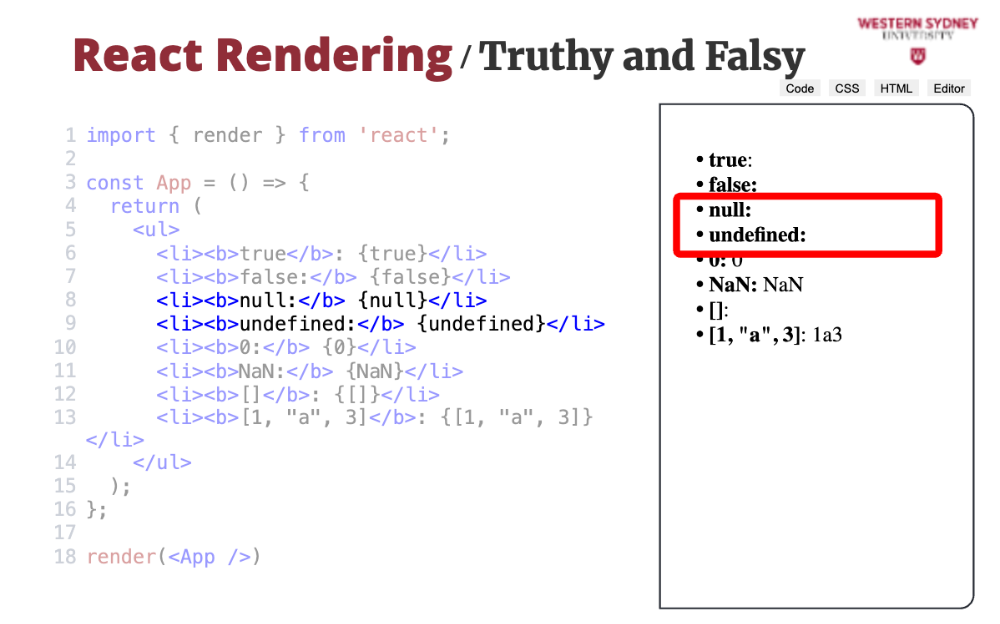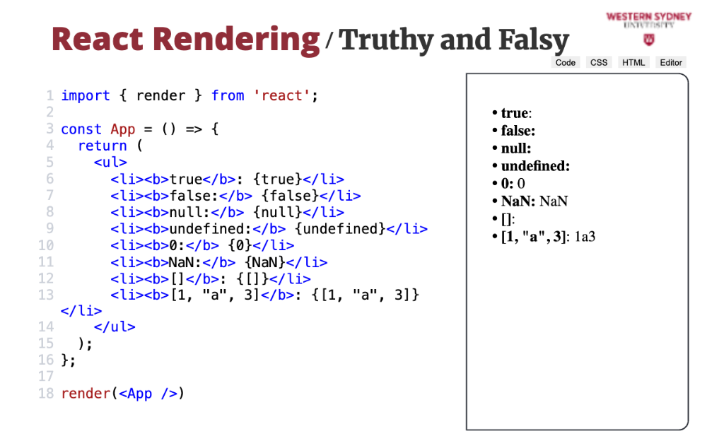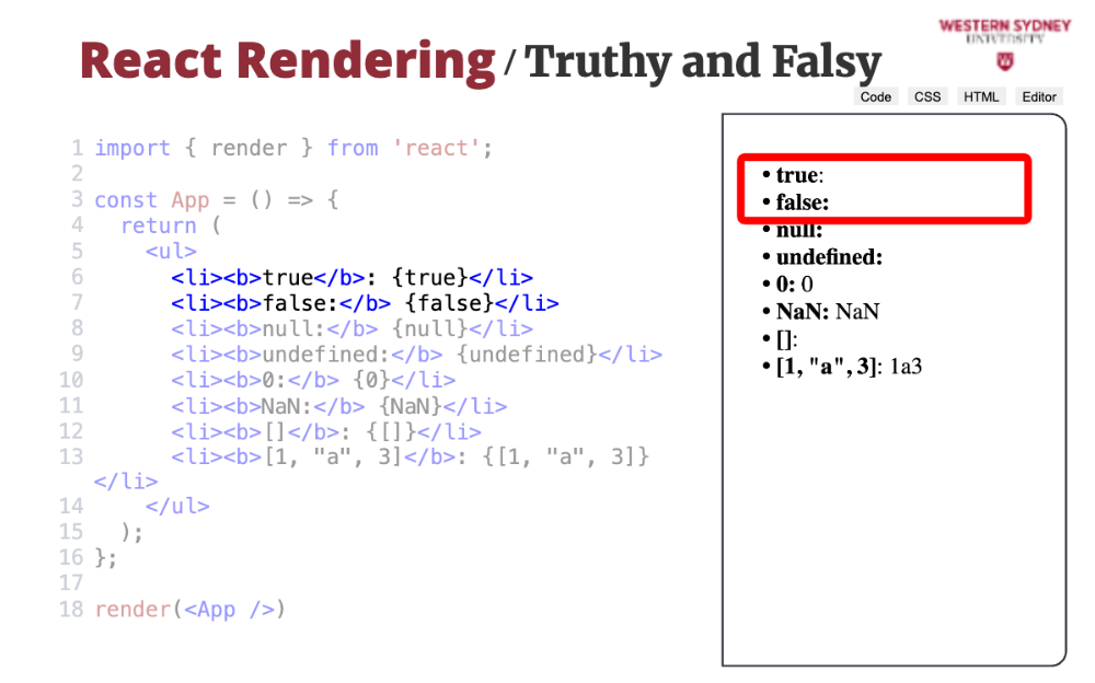 First, let's check out how React handles and renders different truthy and falsy values. Check out the example below: