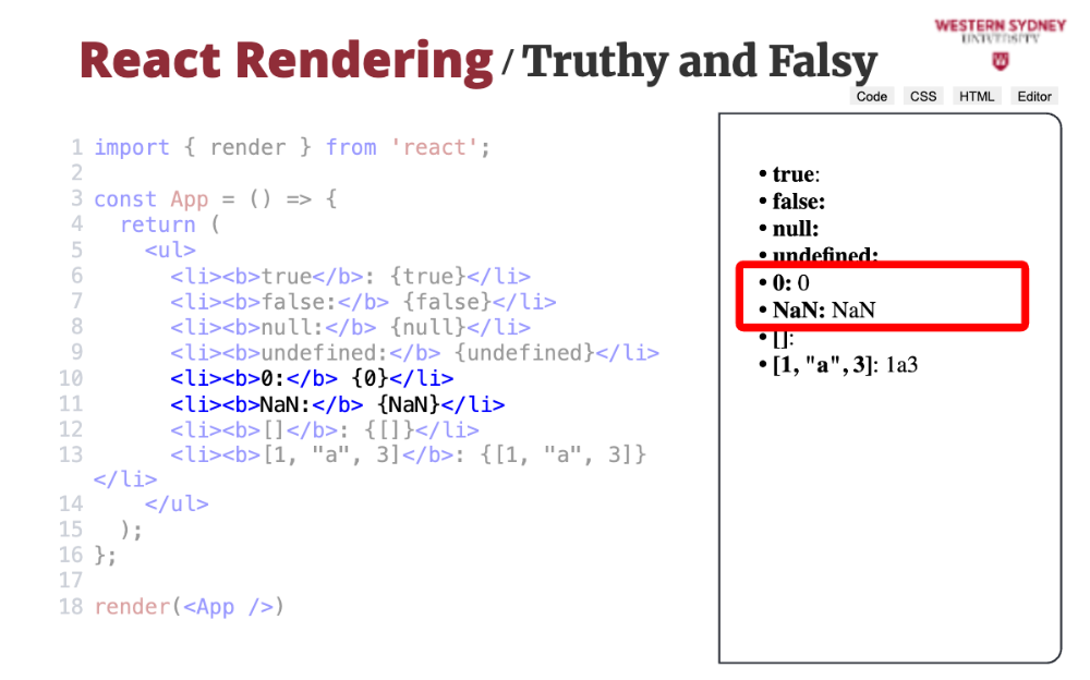 But, while 0 is also a falsy value, React does render it. This is important when testing for numeric values in logical chains, as we will show soon. Similarly, the NaN value renders the NaN string.