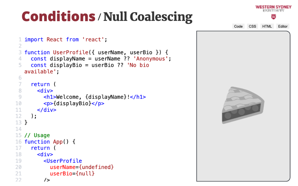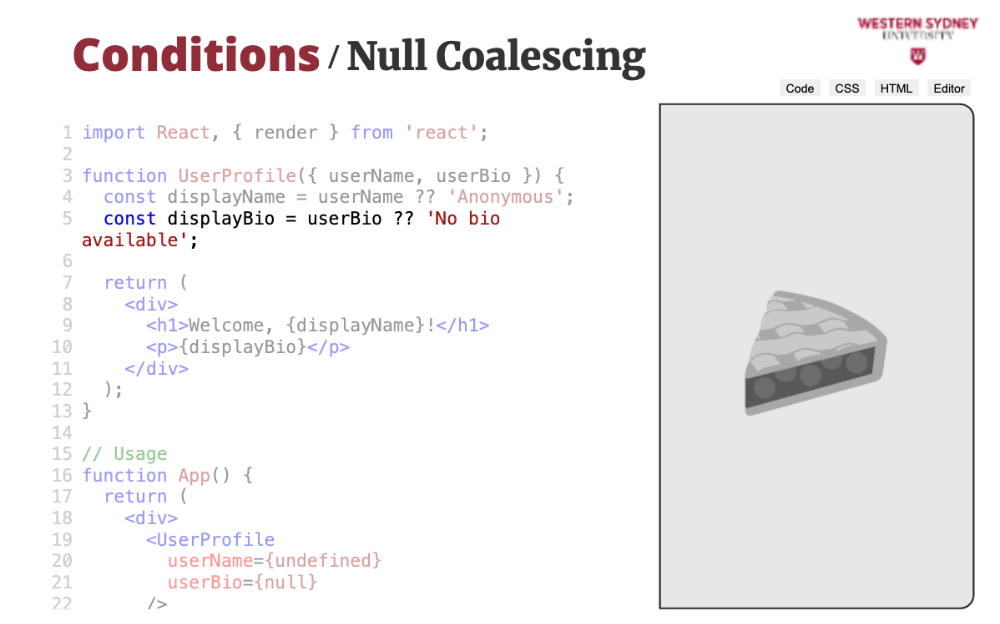 Let's use the same React component from before, but this time we'll use the ternary operator to handle the conditions. This will help illustrate the difference between using the null coalescing operator and the ternary operator.