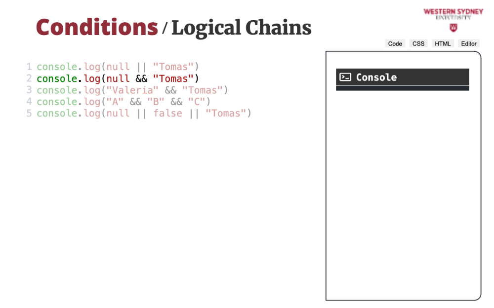 Last, this OR chain will return value "Tomas" as it is a truthy value, and all the previous falsy values are ignored.