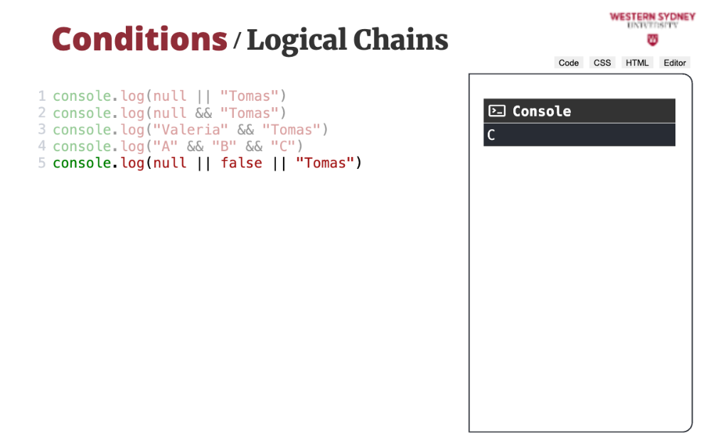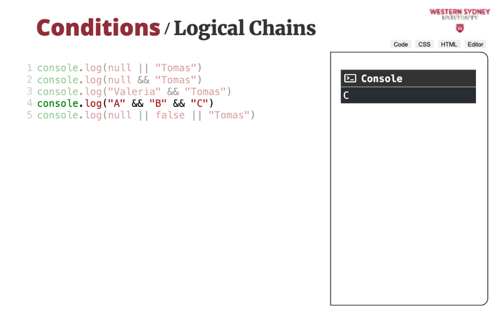 Similarly, this AND chain returns value C as values "A" and "B" are truthy.