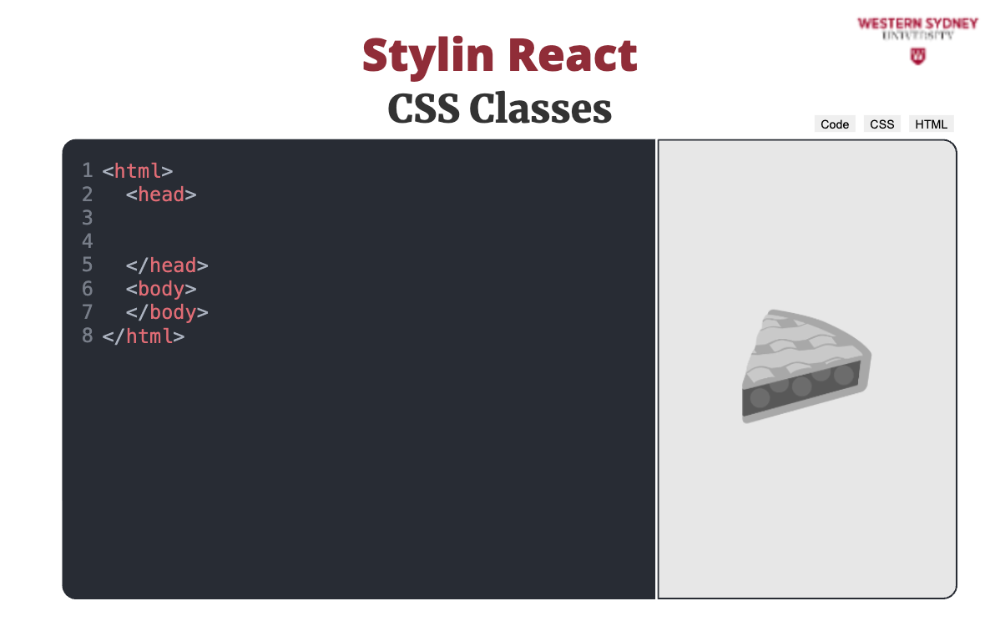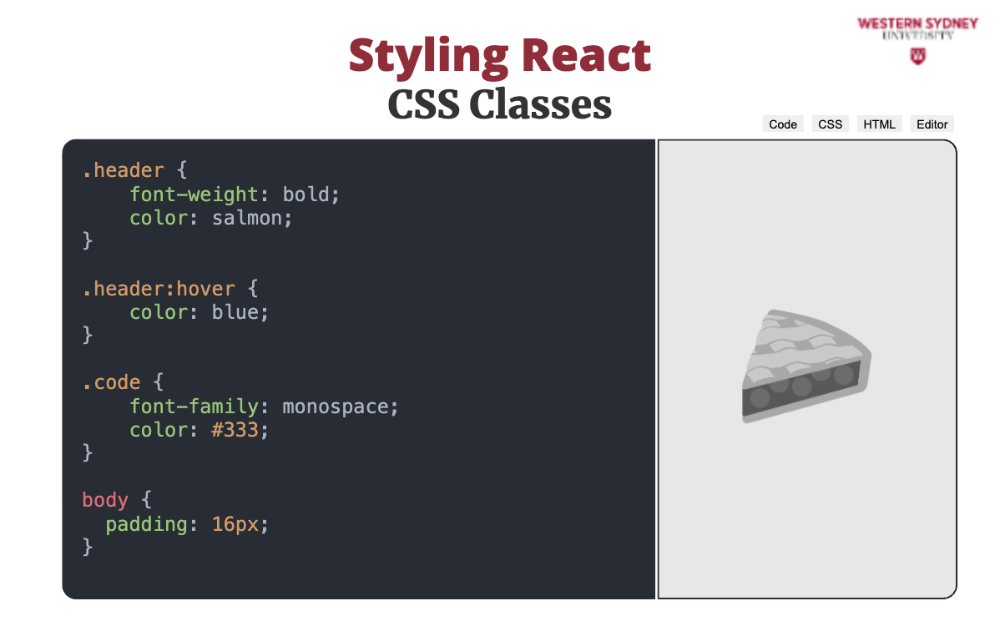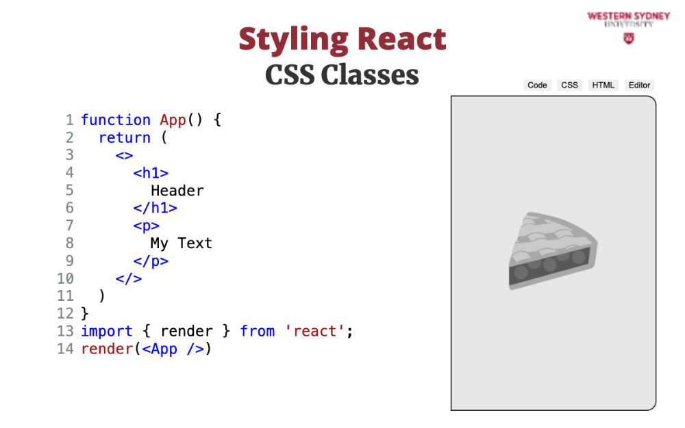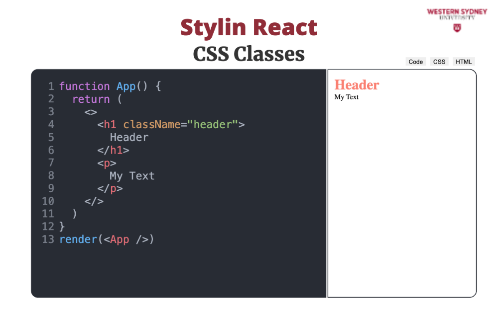 import "./styles.css"Using CSS files in your application creates global classes shared in your application. But how do we use this? In html we specify CSS classes using class such as <h1 class="header">. Would you know what the problem is with that in JSX?