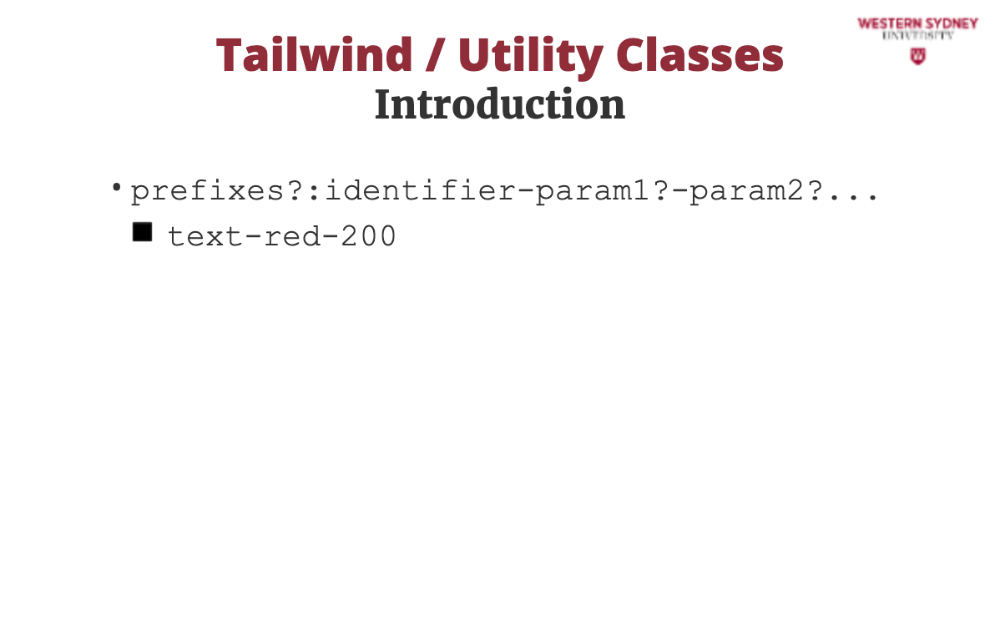 Consider this utility class with identifier text and two parameters, red and 200. This class sets the colour of the text to red with a shade of 200.