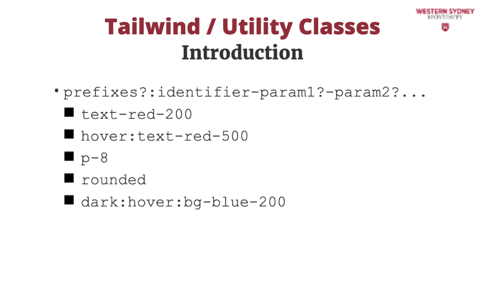 Each tailwind utility class starts with zero or more prefixes, followed by the class identifier and parameters separated by hyphens.