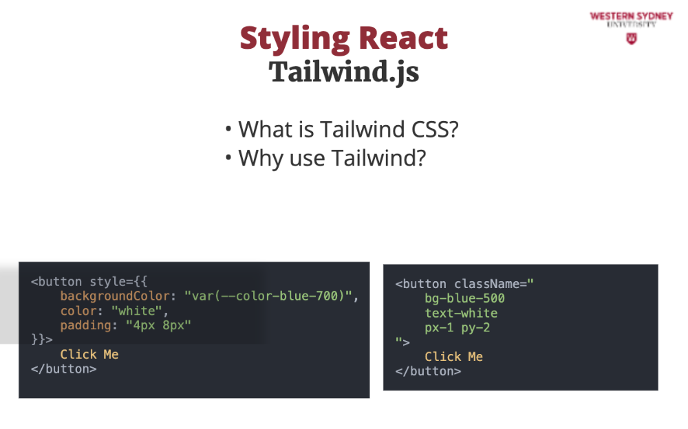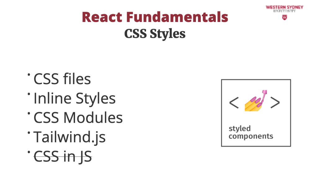 In React, you have multiple options for how to style your components using CSS. In this section, we explore CSS files, Inline styles, CSS modules and Tailwind.js.