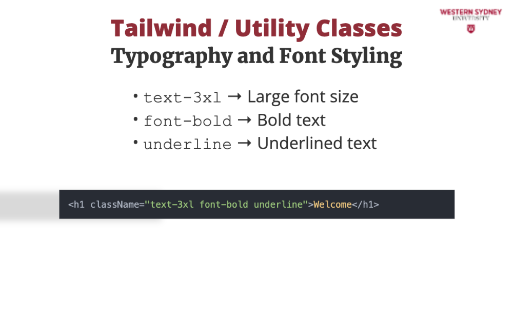 For typography, there are multiple utility classes. The variation of utility class text with one parameter sets the size. The sizes, such as sm, md, lg or xl can be customised in the tailwind configuration. Other utility classes, such as font modify further properties of text.