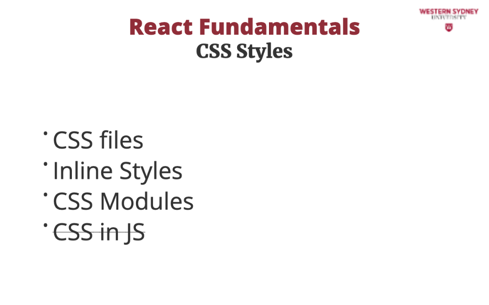 We will not talk about CSS in JS, as your approach will depend on selection of the CSS library, such as Emotion or Styled Components.