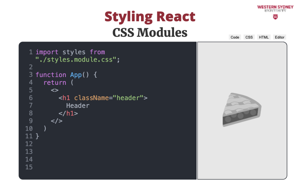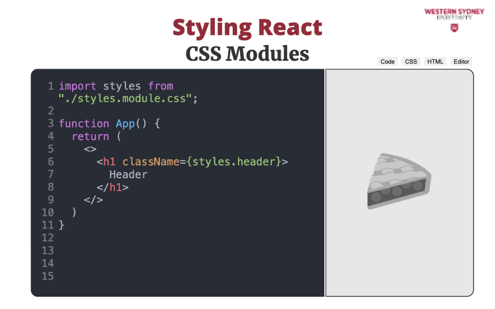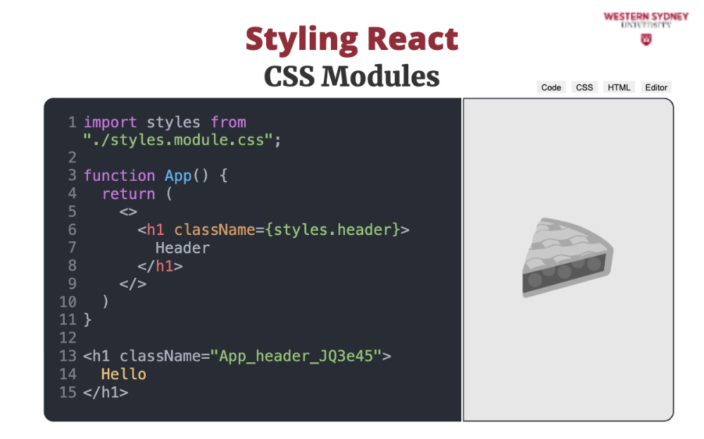 <h1 className="App_header_JQ3e45">Hello</h1>Consequently, you can use the same name of the CSS class across multiple CSS modules, without worry to create conflicts. In Skillpies editor we do not support CSS modules, only global CSS files and inline styles. But, some of our external exercises will use CSS modules, so be on the lookout!