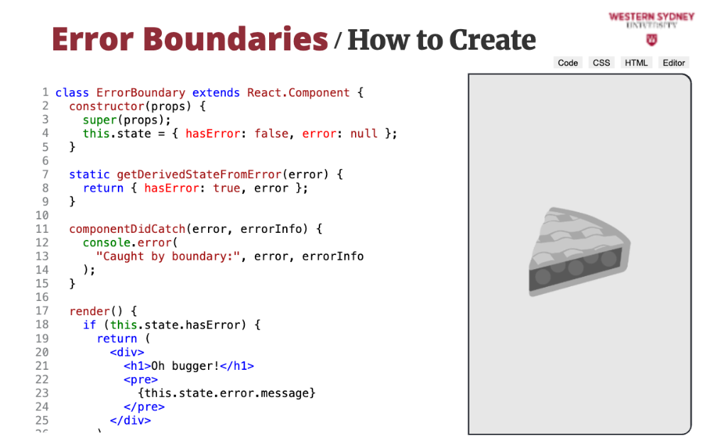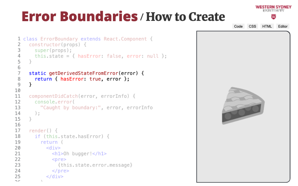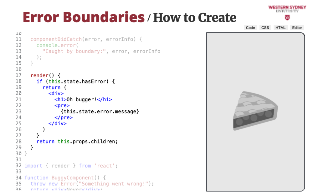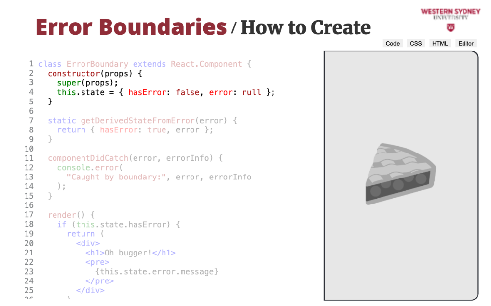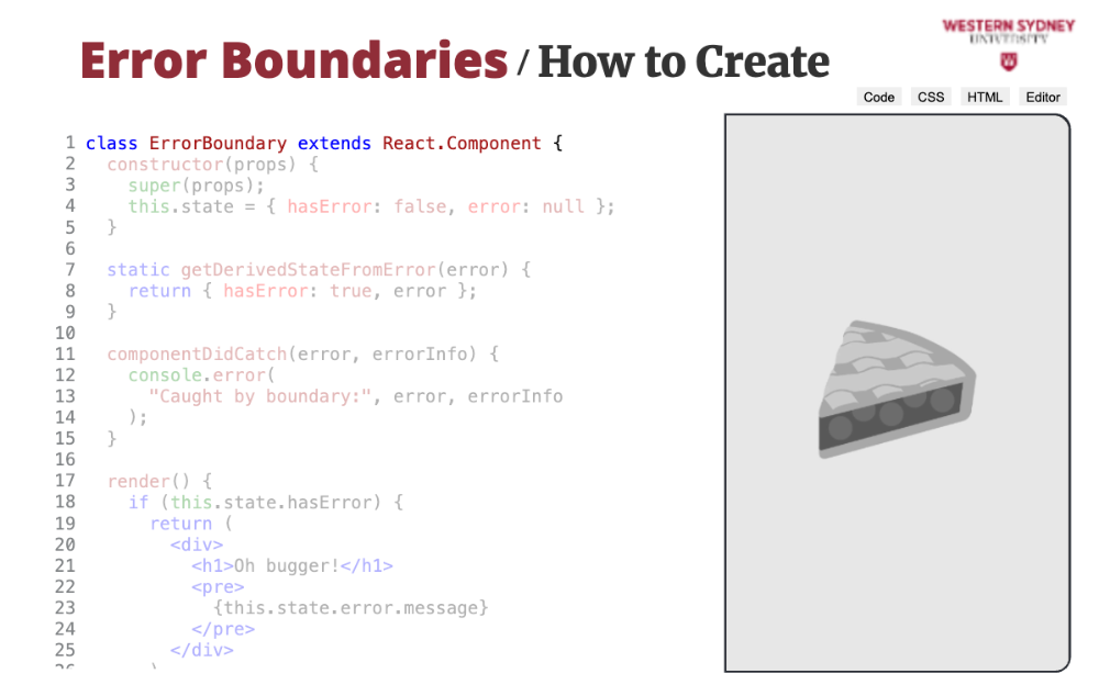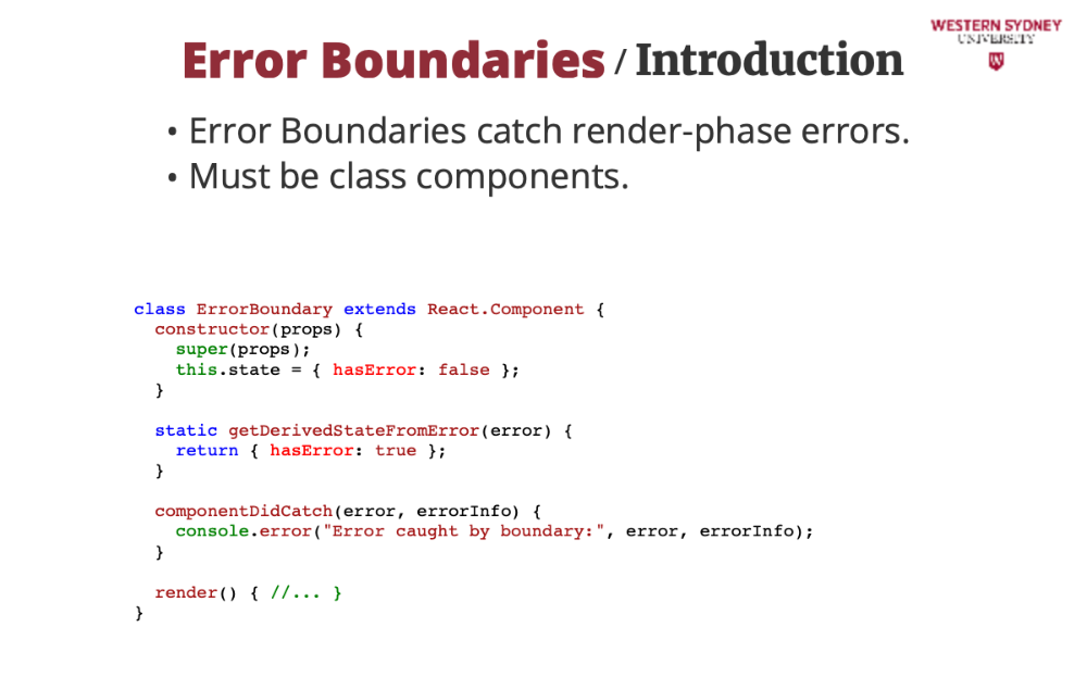 We mentioned earlier that the error boundary must be a class component, as it uses some React wiring not available in functional components.