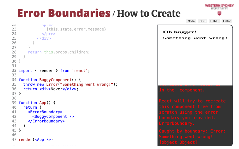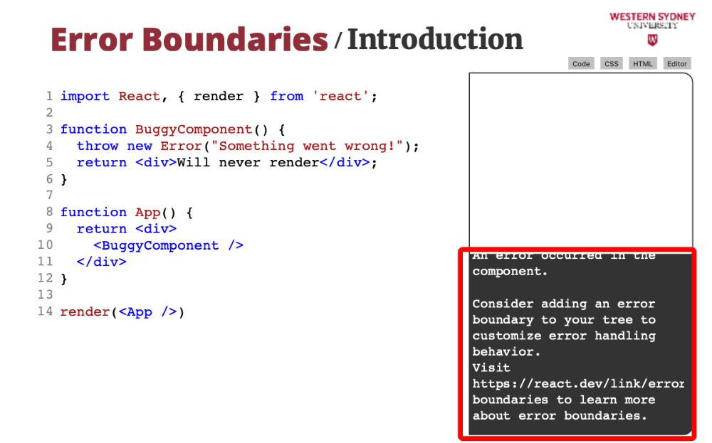 This means they won’t help with event handlers or async code, but purely focus on synchronous errors thrown in your components.