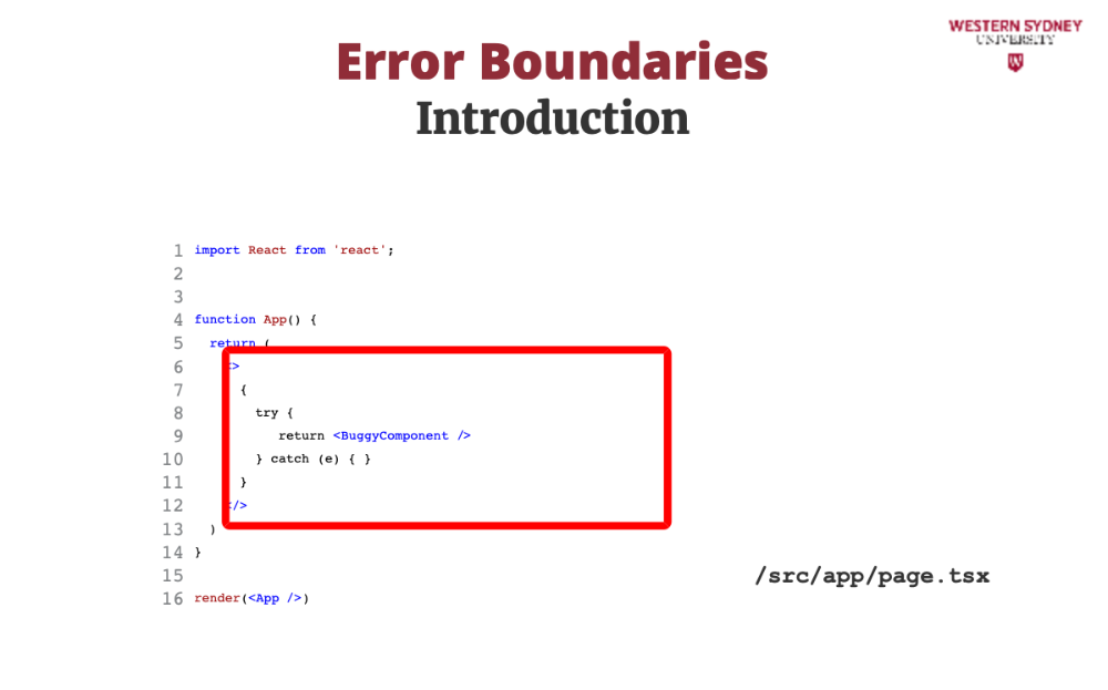 First the try catch is a block statement and its syntax will not work in JSX. Second, and more importantly, React rendering is asynchronous and try catch assumes synchronous code. LEt's explore how can we solve this issue!