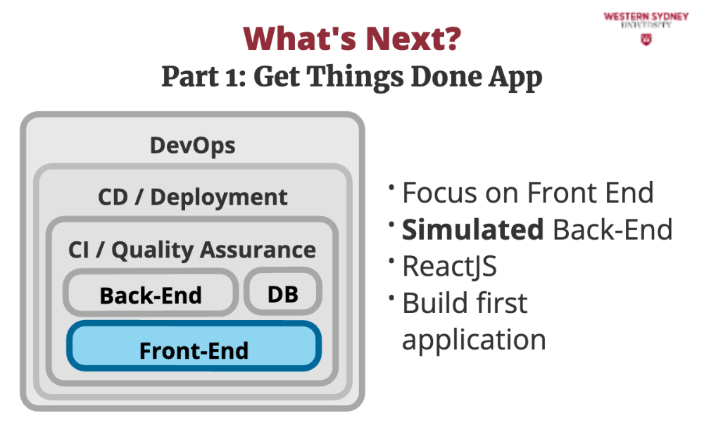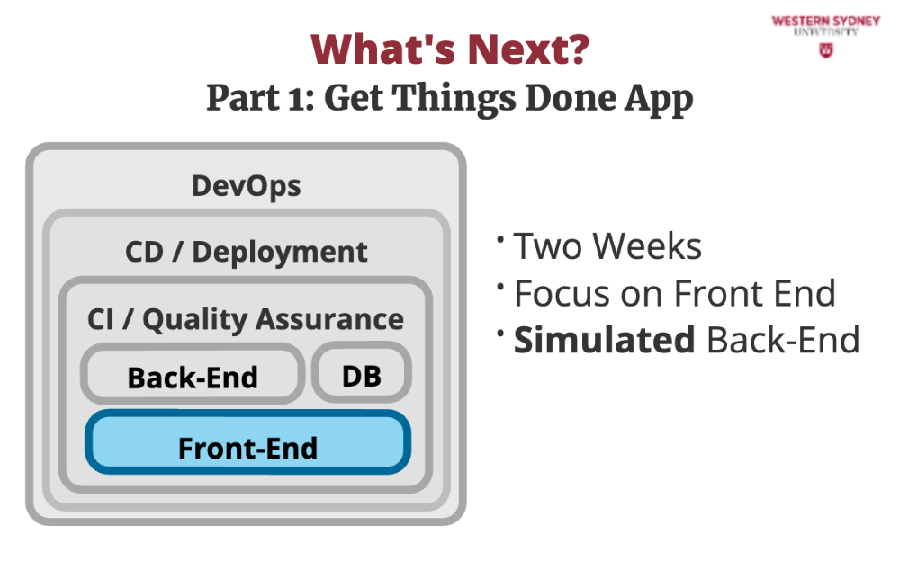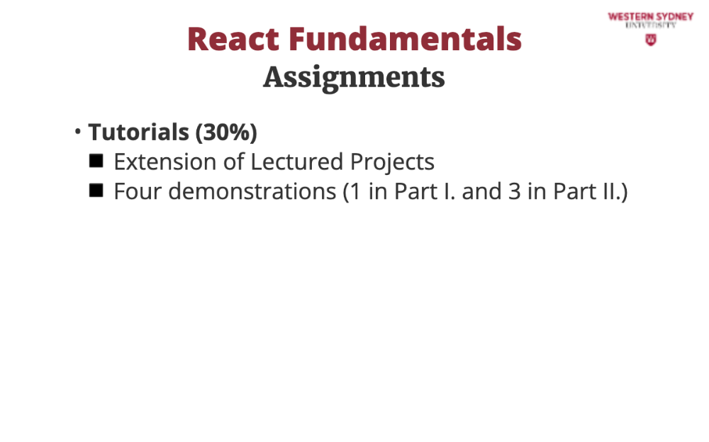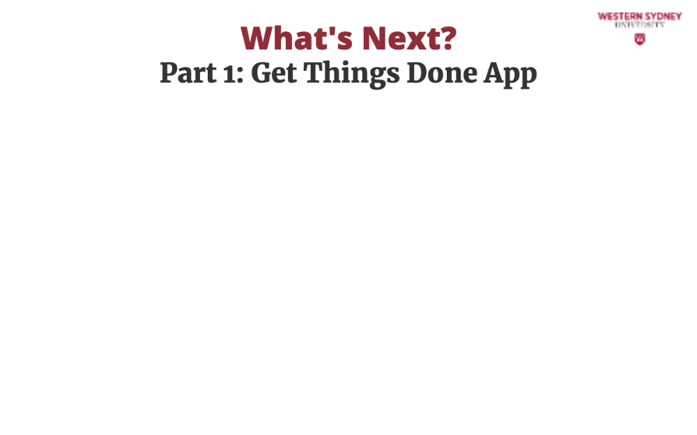 First, in Tutorials, you will extend the functionality of projects discussed during the lectures, such as the GTD and CMS apps. Four times during the semester, you must attend the tutorial and present your work to your tutor. The tutor will ask questions to ensure you reach that part's learning outcomes. The questions will relate to the functionality you just implemented.