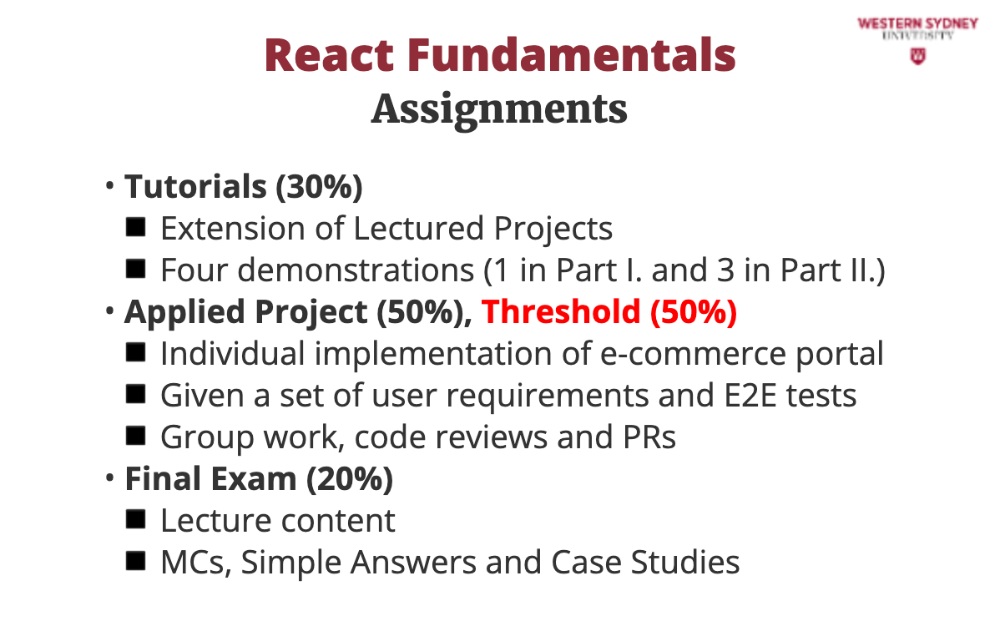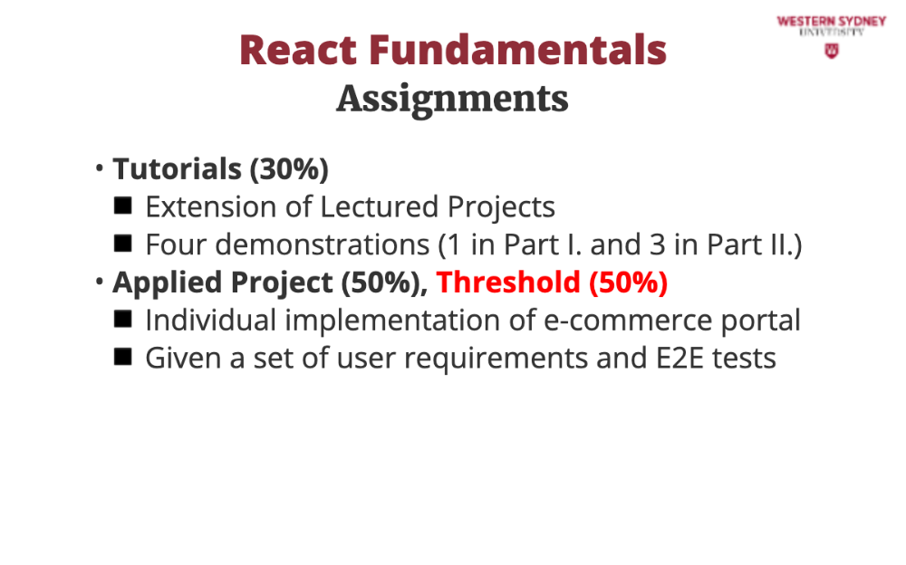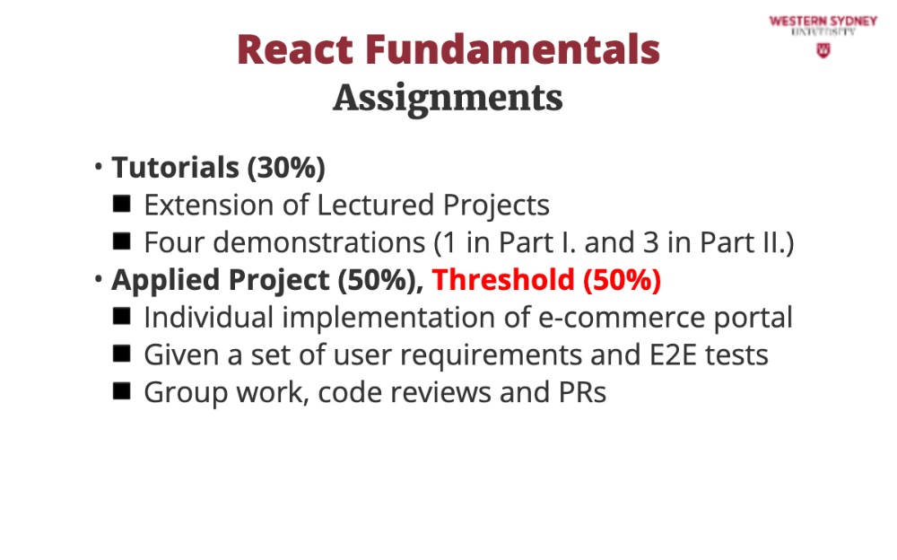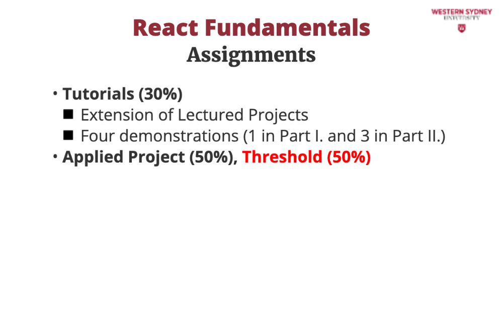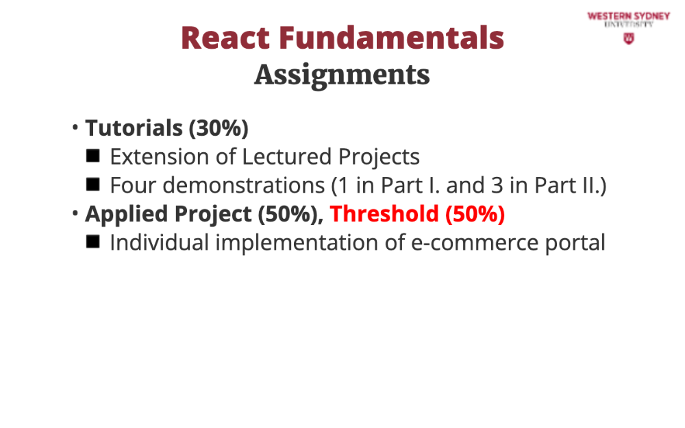The most important part of this course is the applied project that forms 50% of your grade. Also, this assessment has a 50% threshold; thus, failing this assessment means you fail the whole course.
