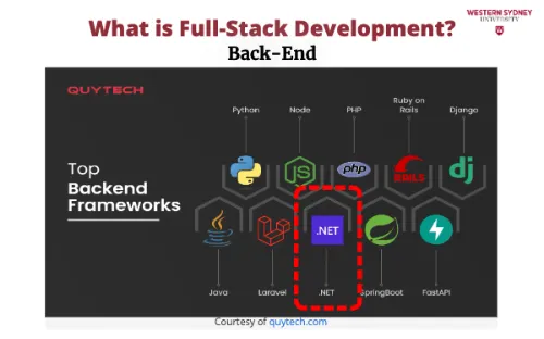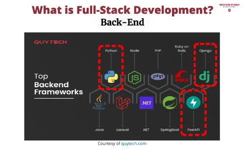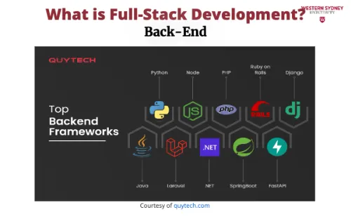 Due to the limitations of programming language support in browsers, the front end is usually built with HTML, CSS, and Javascript. But, in the backend, you have more freedom to choose your programming language and architecture.
