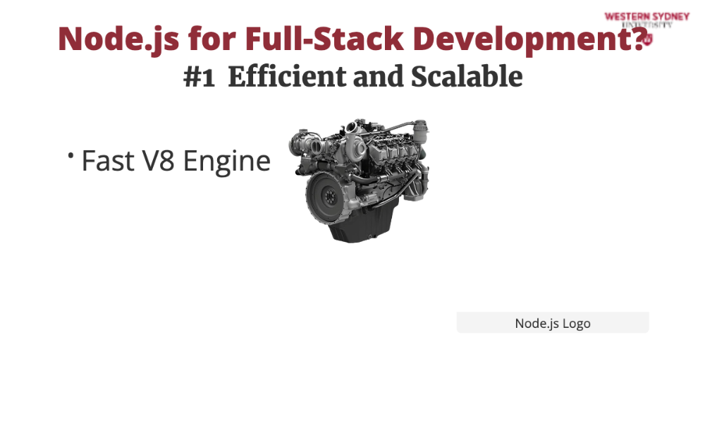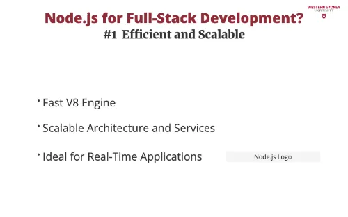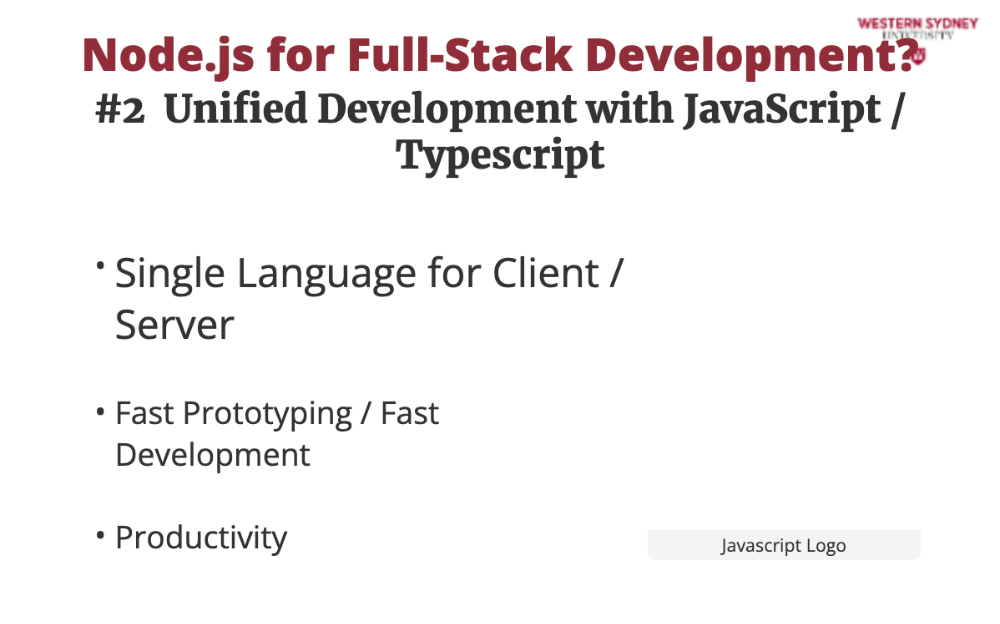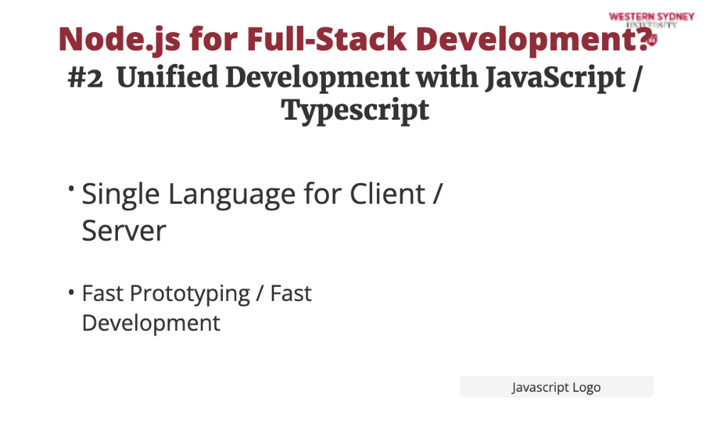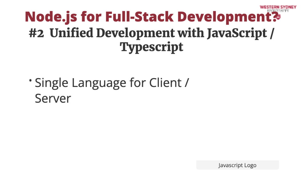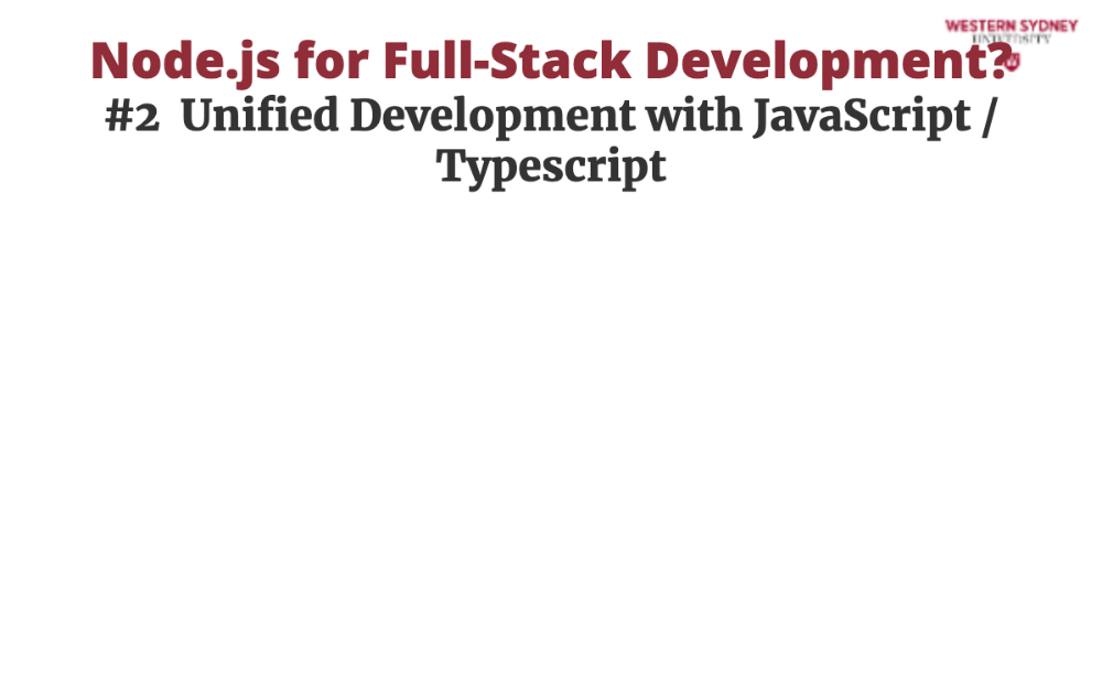NodeJS unifies development across the entire stack using a single programming language, JavaScript or TypeScript.