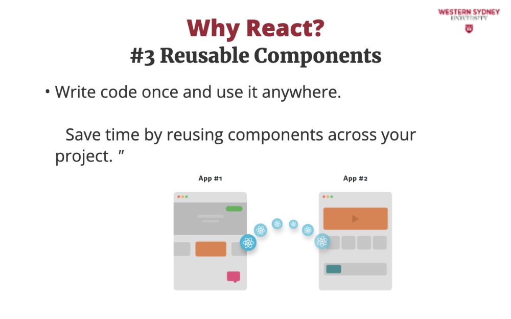 React composes user interfaces from components. You can reuse components across many projects, saving you much time. You can also use ready-made components from open-source or commercial UI frameworks or package providers such as NPMJS