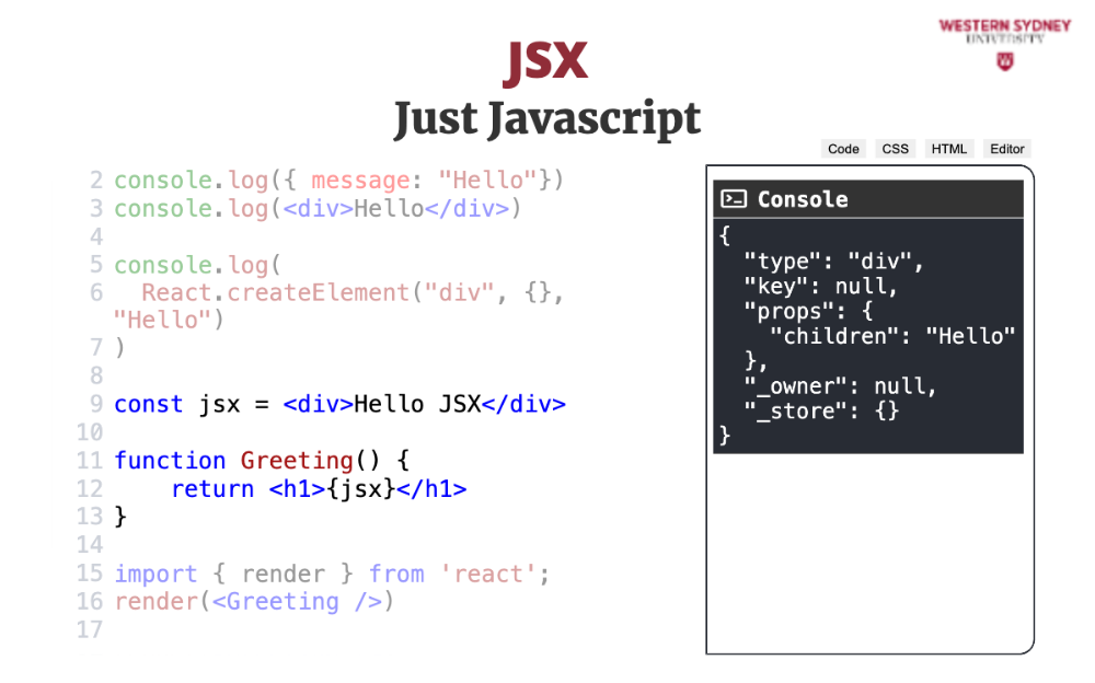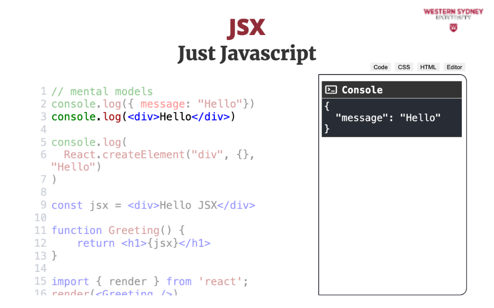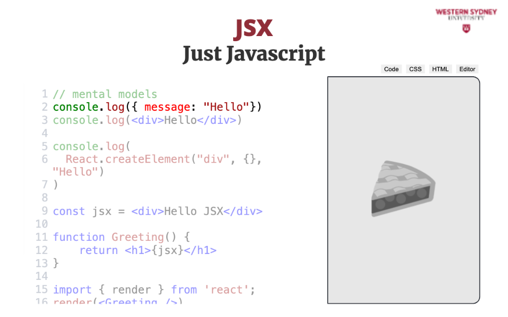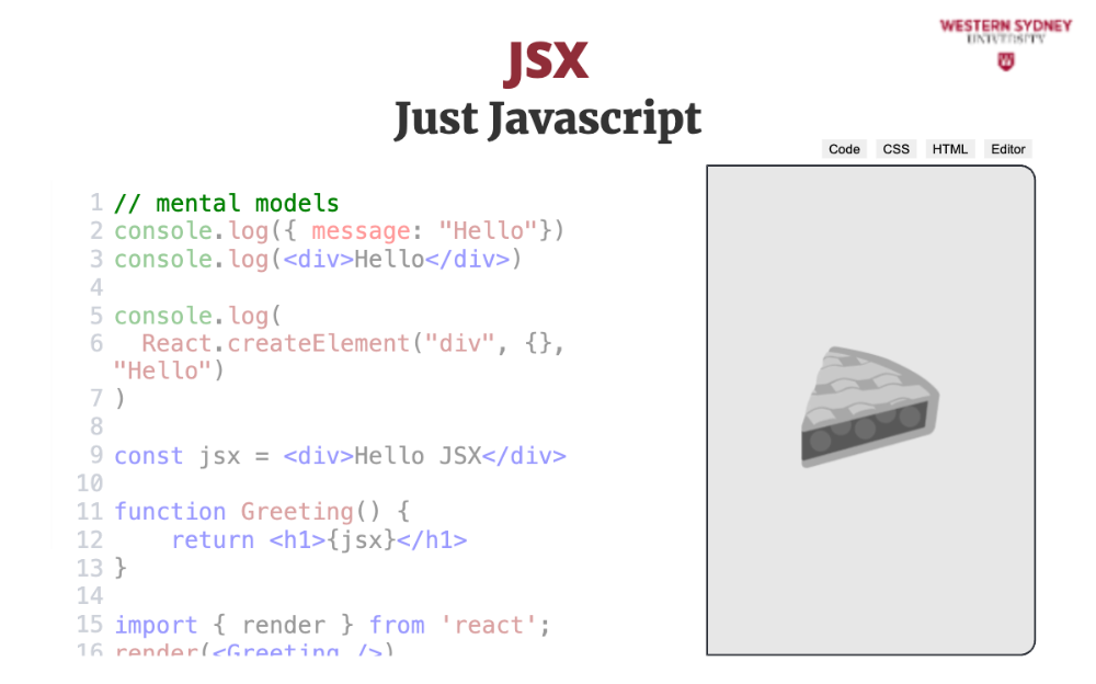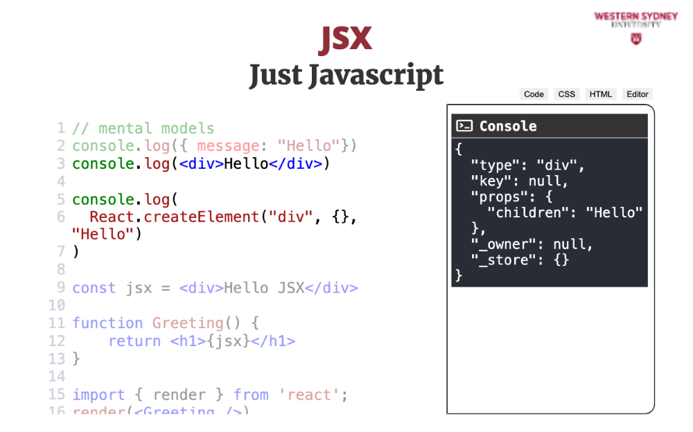 Let's explore the mental model behind JSX. The most important thing to realise is that JSX is not HTML. It is Javascript.