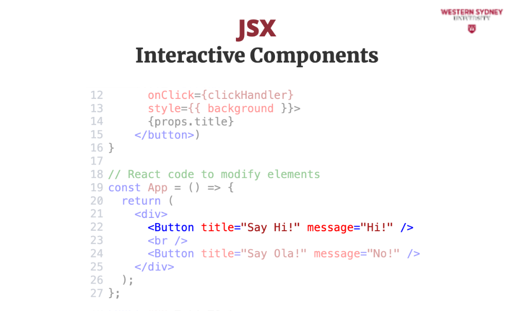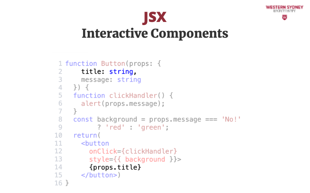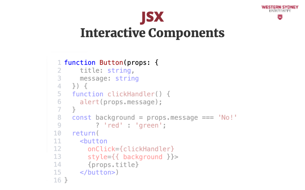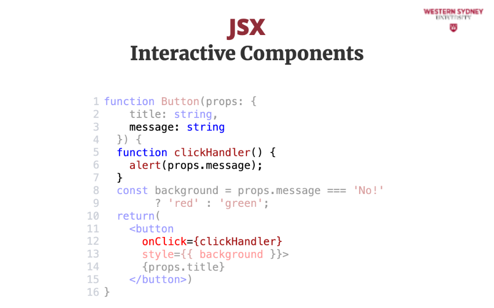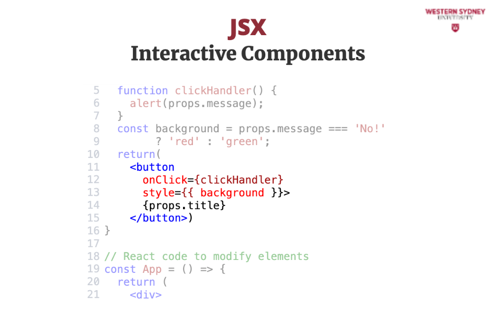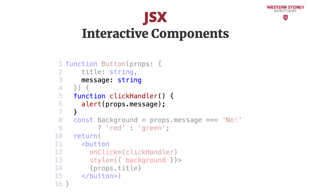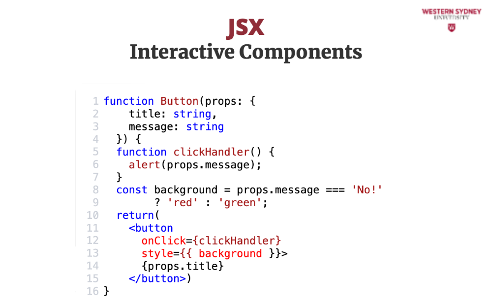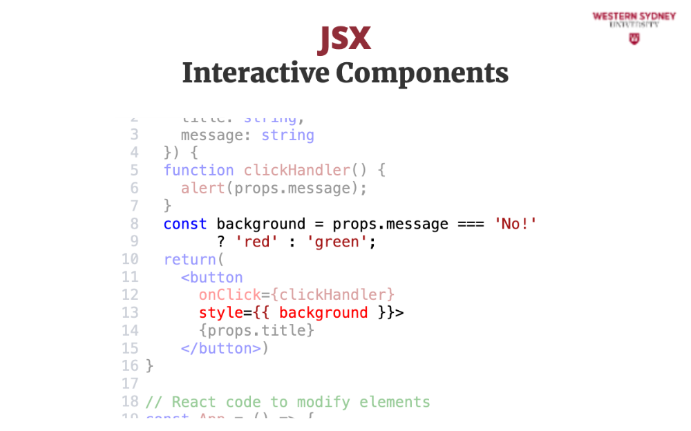 In this example, we're creating a Button component that takes a title prop and a message prop. When the button is clicked, it will trigger the clickHandler function and display the message. The button is is styled in CSS, but the background is styled using inline styles based on the value of the message prop.