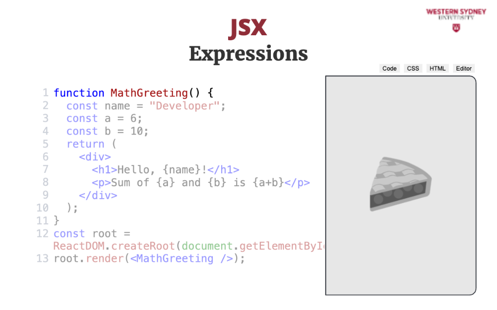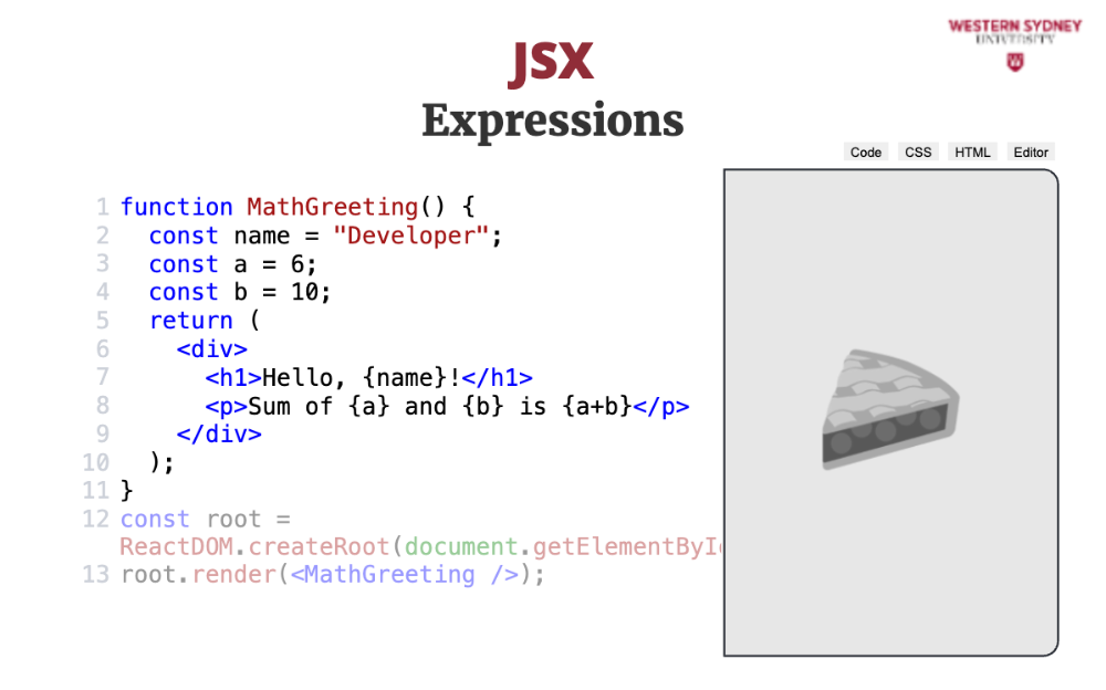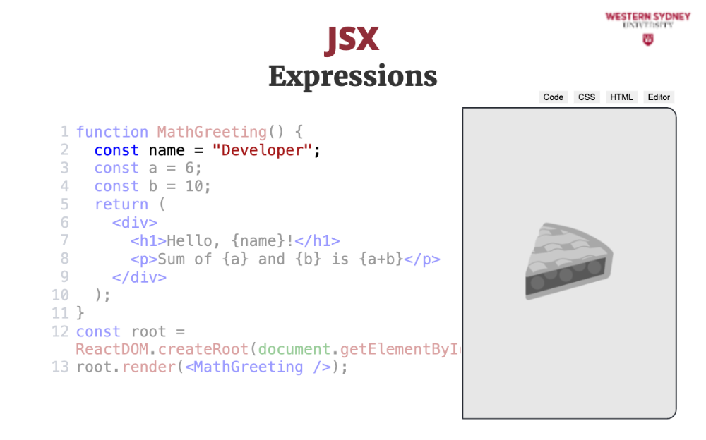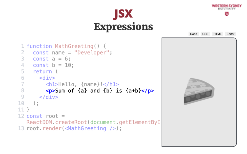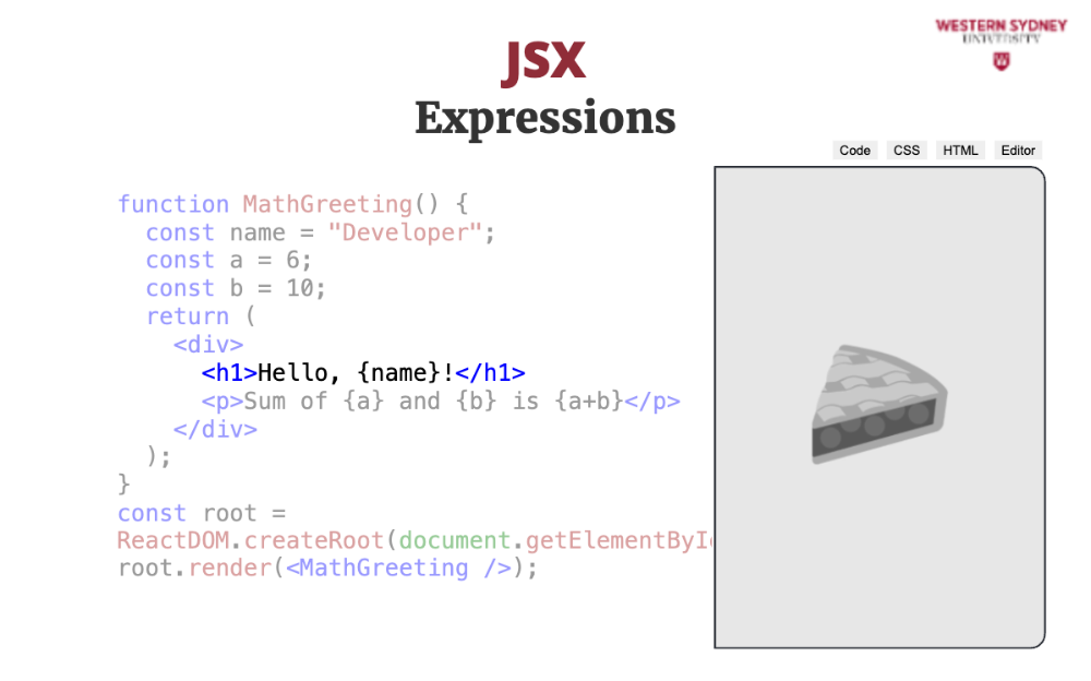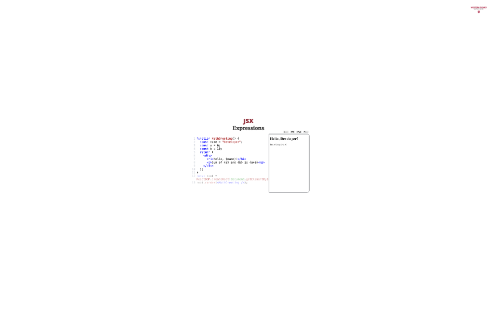 JSX allows you to use JavaScript expressions inside your HTML by wrapping them in curly braces. Check out the following example: defining a name variable inside the MathGreeting component and rendering it inside the <h1> tag using curly braces. We are also rendering a sum of numbers stored in variables a and b. In fact, we can execute any Javascript expression inside curly braces apart from block statements, such as function definitions or return statements.
