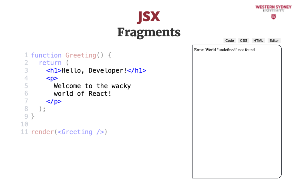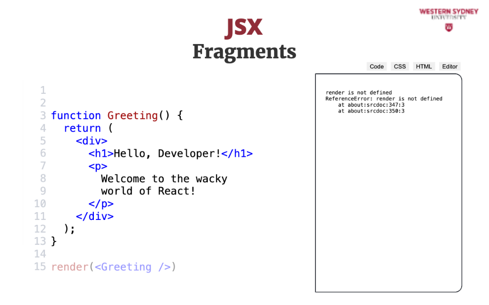When you run this example, you will receive an error telling you that the adjacent JSX element must be wrapped in an enclosing tag.