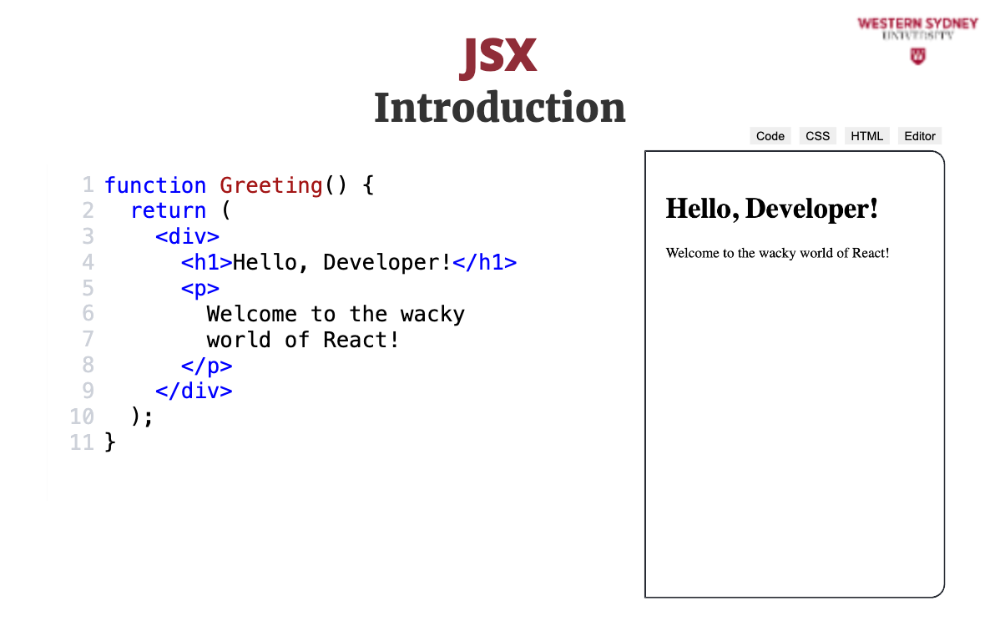 JSX allows you to write your components in a way that's easy to read and understand, even for someone who's new to web development. Here's an example of what JSX looks like. We're creating a React component called Greeting. The function's name defines the component's name.