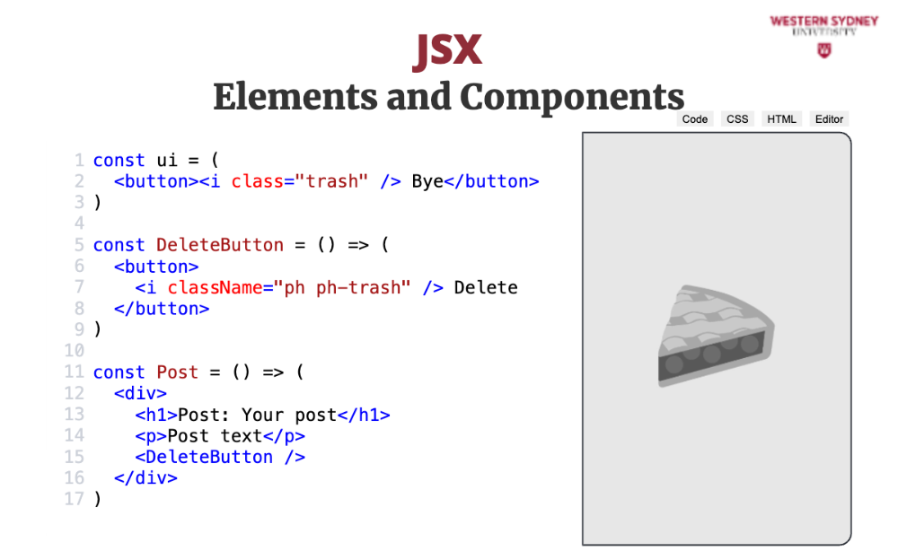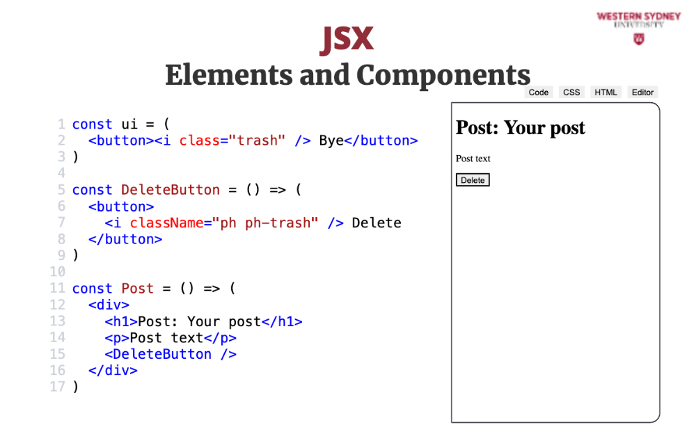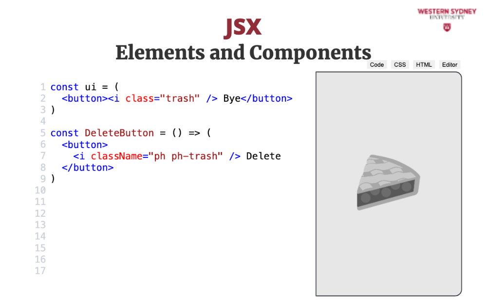 When using the custom DeleteButton react component, we use standard html notation. Since we use capital letters, react components stand out from the standard html element.