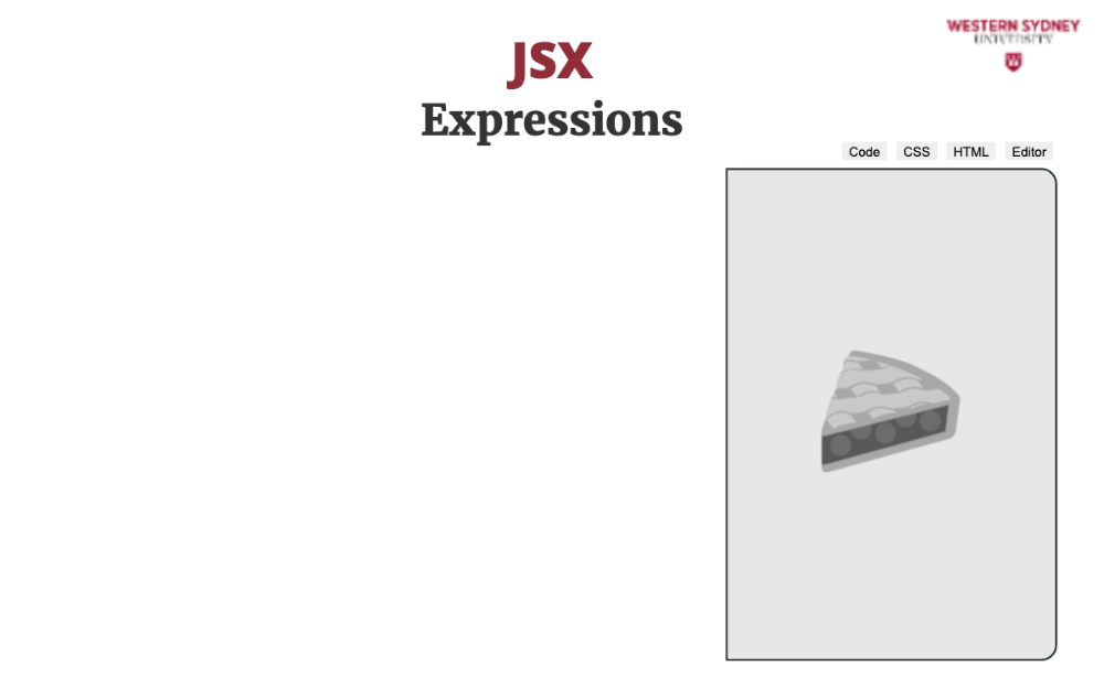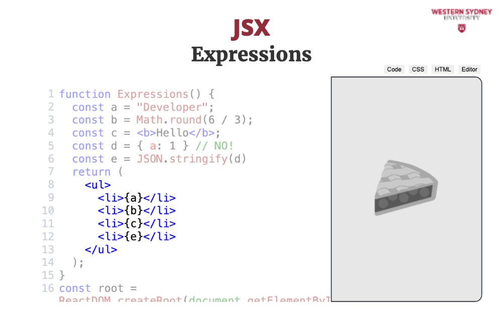 JSX allows you to use JavaScript expressions inside your HTML by wrapping them in curly braces, called string interpolations. Check out the following example.