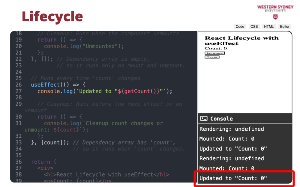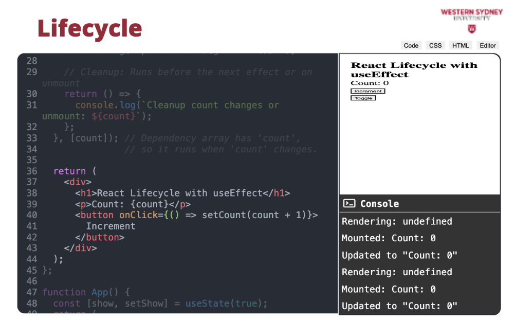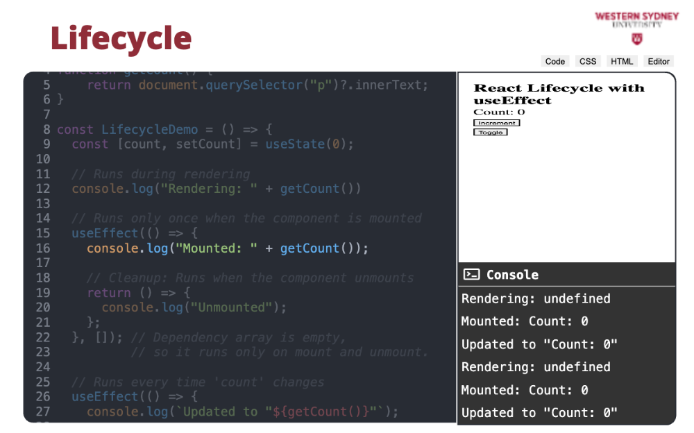 export default LifecycleDemo;useEffect(() => { ... }, [])useEffect(() => { ... }, [dependencies])useEffect.