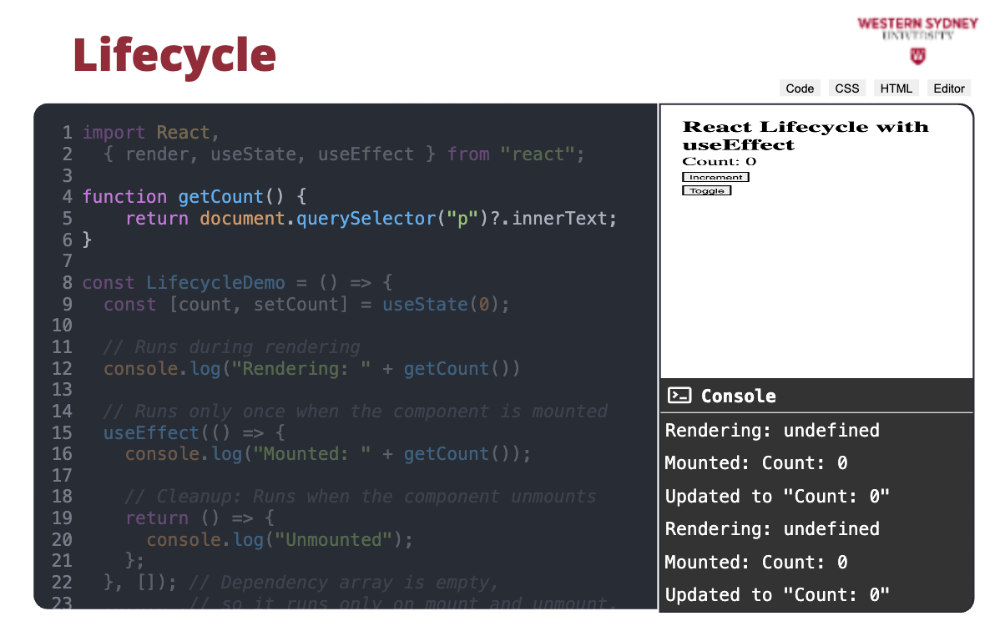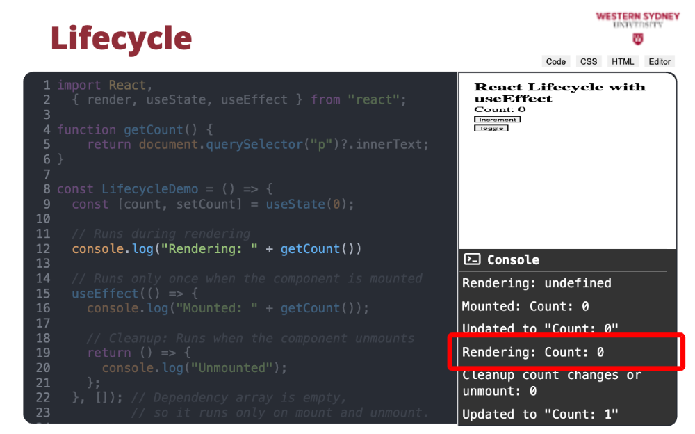 useEffect runs after rendering.useEffect run before the component unmounts or re-renders.Let’s demonstrate these lifecycle phases using useEffect: