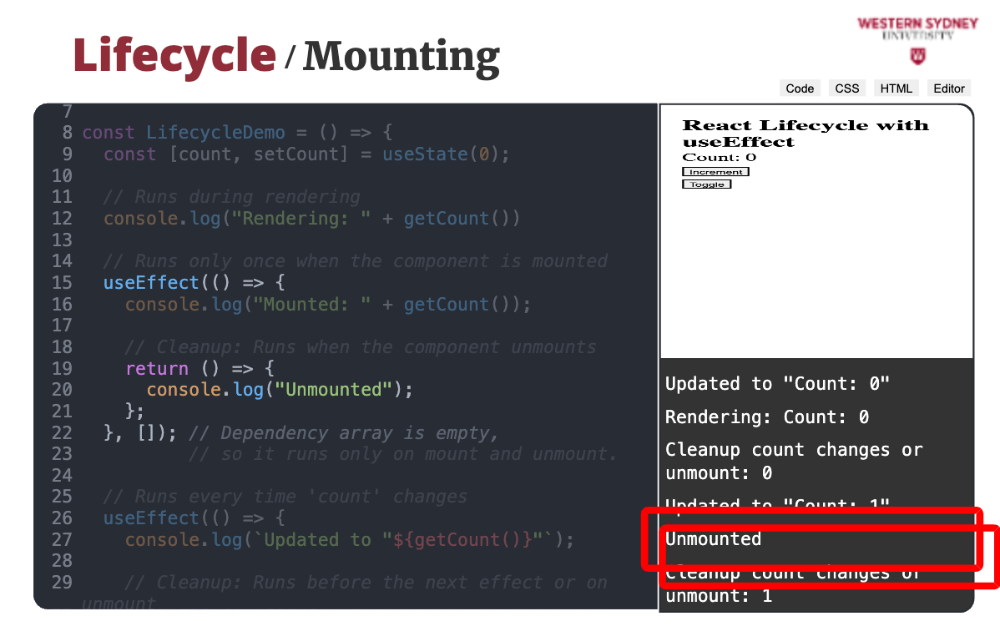 During the unmounting phase, the component is removed from the DOM, performing the cleanup. Let's break it down using an example!
