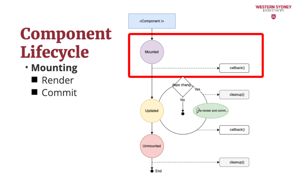 During the mounting phase, the component is first rendered and committed to the browser. At this stage, all HTML is visible to the user. After committing, a callback is called.