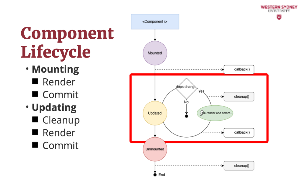 During the updating phase the component re-renders due to state or prop changes. This process has three phases. First, a cleanup after the previous update is performed. Then, the component is rendered and then the changes are committed to DOM.
