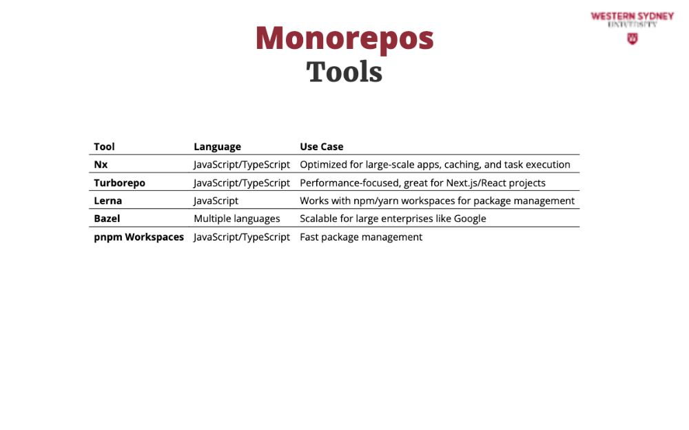 Monorepos typically use workspace management tools to handle multiple projects efficiently. These tools ensure that dependencies are shared and optimised. These are some of the popular monorepo tools. In our case we will use turborepo and pnpm for package management.