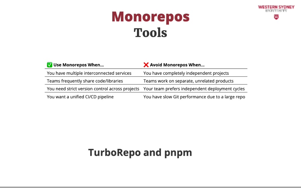 Use Monorepos when you have multiple interconnected services, share code or libraries, need strict version control across all projects, or create optimised, unified CI/CD pipelines. Please don't use Monorepos when your projects are completely independent or when you prefer to have independent deployment cycles.