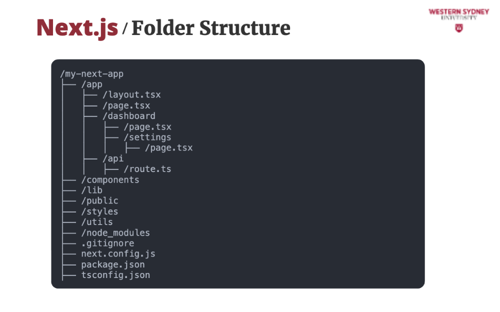 Next.js follows a convention-based folder structure that helps organize your project efficiently. Depending on whether you use the App Router (app/ directory) or Pages Router (pages/ directory), the structure will differ slightly. We will focus on app router only