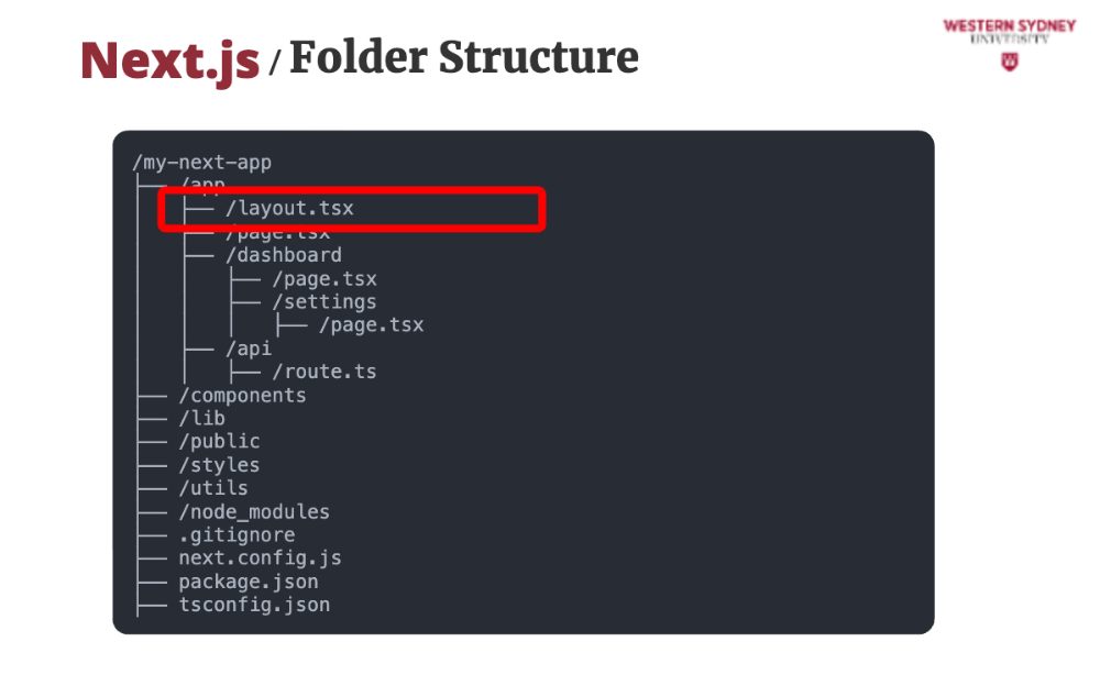 The layout tsx file defines the root layout of your application. It persists across all pages, making it ideal for headers, footers, and other shared components. This is a Server Component.