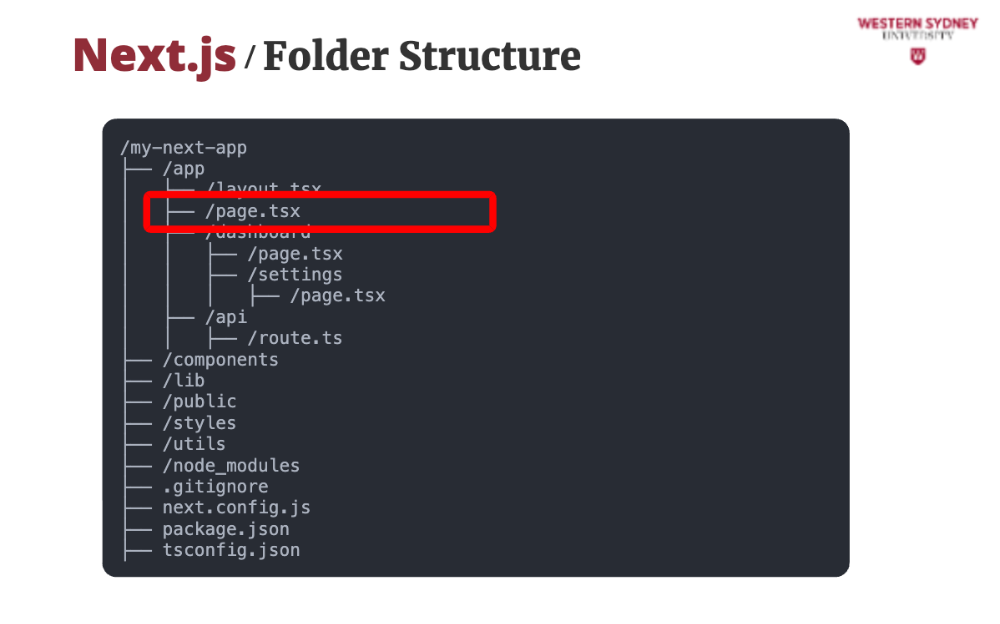 Nested directories within app create routes. For example, app/dashboard/page tsx creates the /dashboard route. This is also a Server Component.