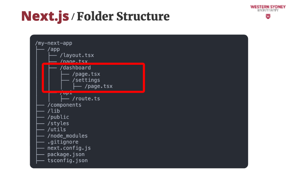 Even deeper nesting is possible. app/dashboard/settings/page tsx would create the /dashboard/settings route. This is also a Server Component.