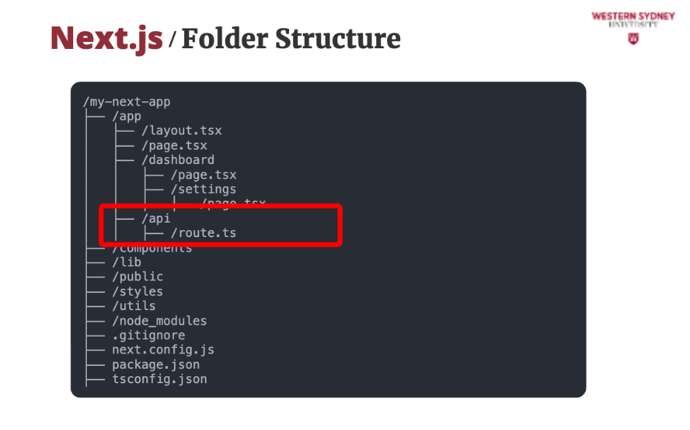 The api directory is for API routes. route.ts files define the handlers for your API endpoints. These are server functions, not components.