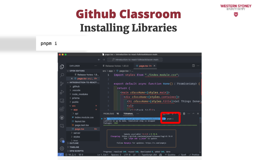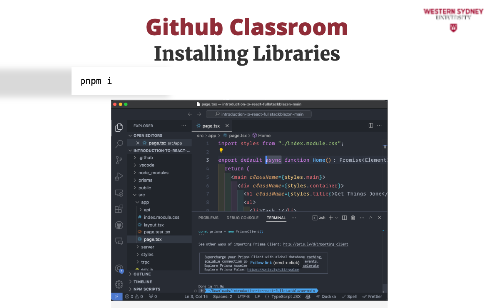 All the script files in the src/app folder, contain many errors (see red squiggles in Figure 1). The problem is that we did not install the packages that the application requires, including React. In the terminal of your editor (the bottom right pane) please type the following command pnpm install and hit enter. This will download all the packages to your project folder. If you want to explore which packages the application needs, please see package.json in the root folder.