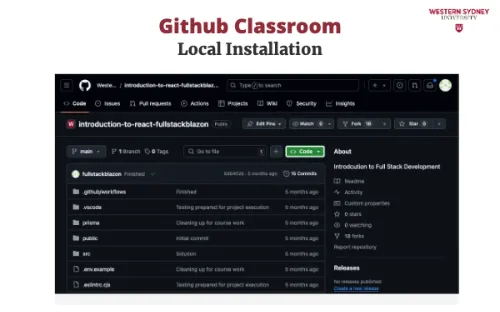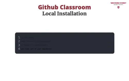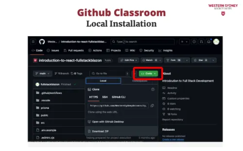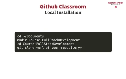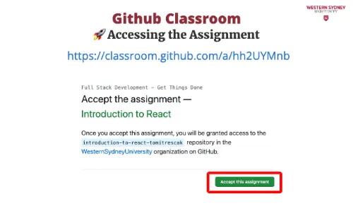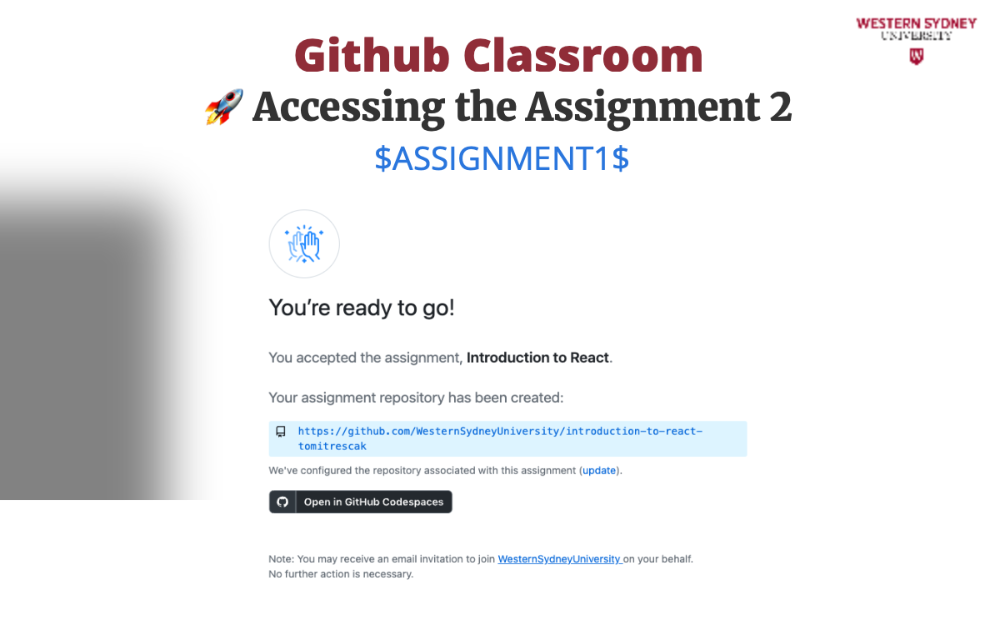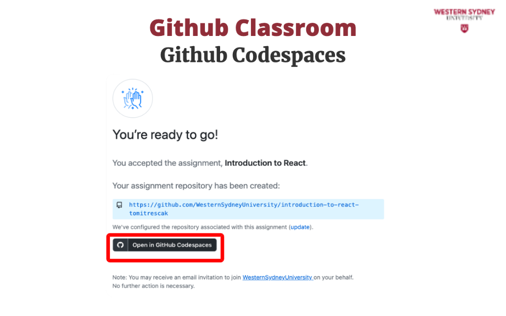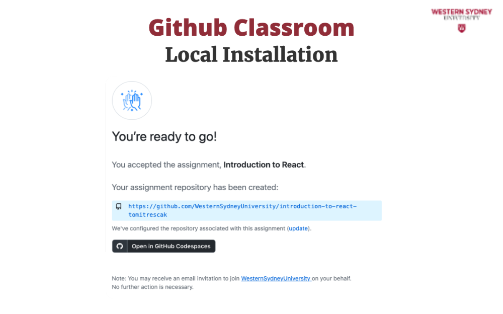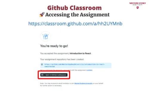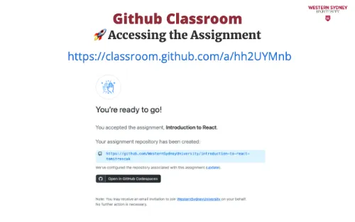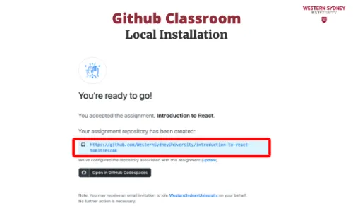 To work on your assignment on your computer, you must download the files from the repository. Make sure that git is installed. First, mark the name of the repository that was created for you for this assignment. It is displayed in the Figure 2 under you're ready to co. In my case, the URL is https://github.com/WesternSydneyUniversity/introduction-to-react-tomitrescak. Please make sure you use your own personalised URL.