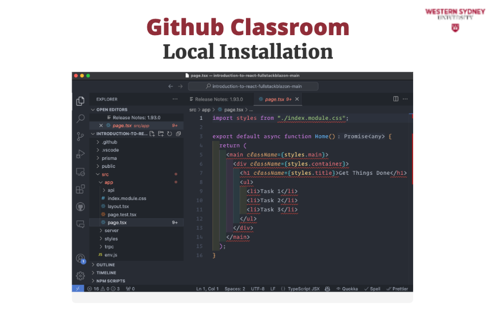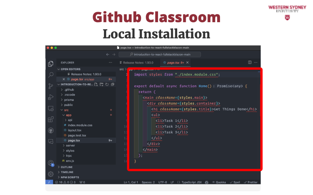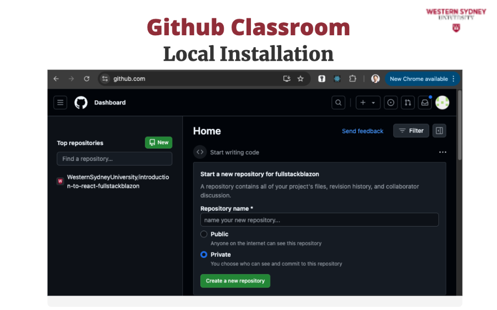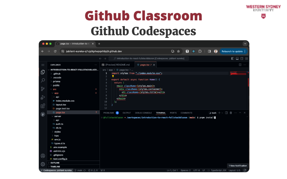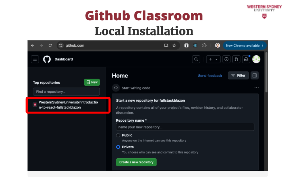 To work on your assignment on your computer, you must download the files from the repository. Make sure that git is installed. First, mark the name of the repository that was created for you for this assignment. It is displayed in the Figure 2 under you're ready to co. In my case, the URL is https://github.com/WesternSydneyUniversity/introduction-to-react-tomitrescak. Please make sure you use your own personalised URL.