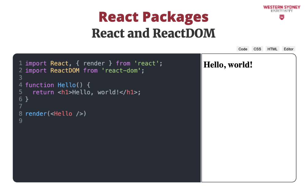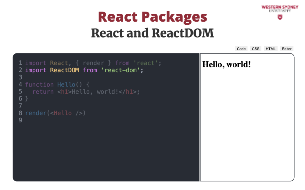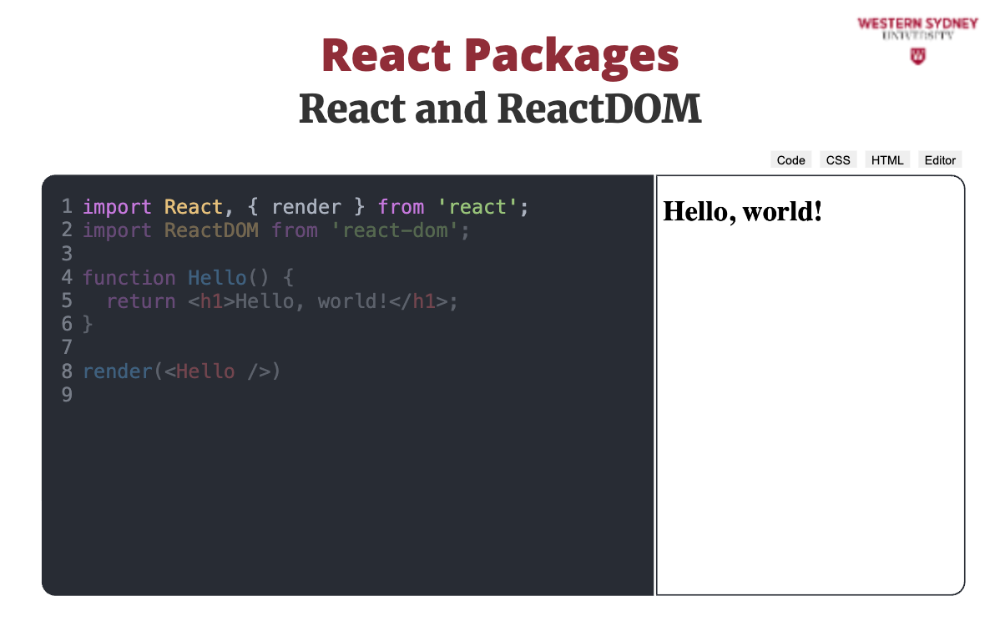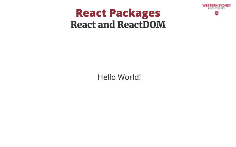 Let's now honour the tradition and show how to display "Hello World" on your screen using ReactJS. We will also explain the role of the two main packages powering React, the ReactDOM package and the React package.